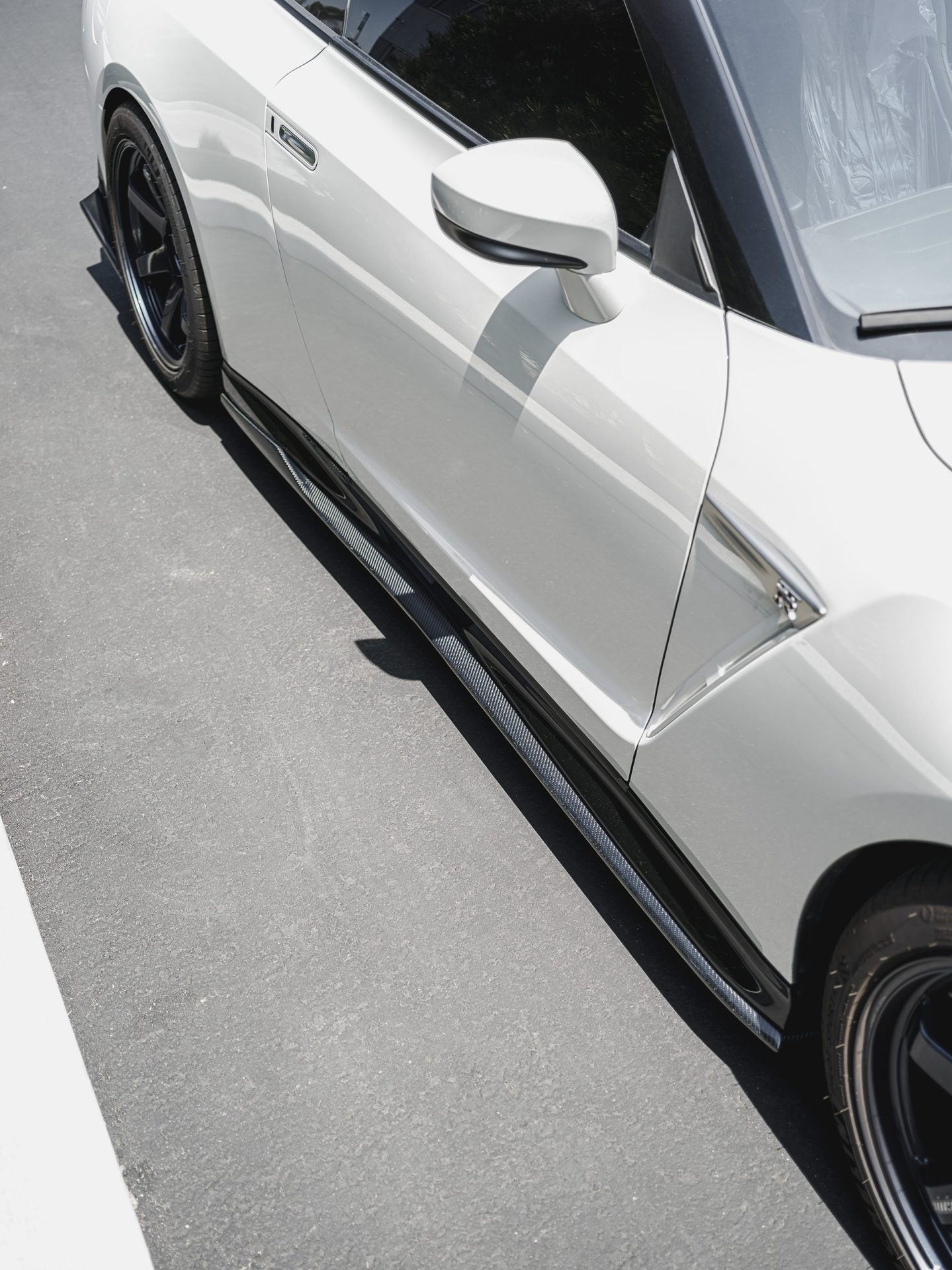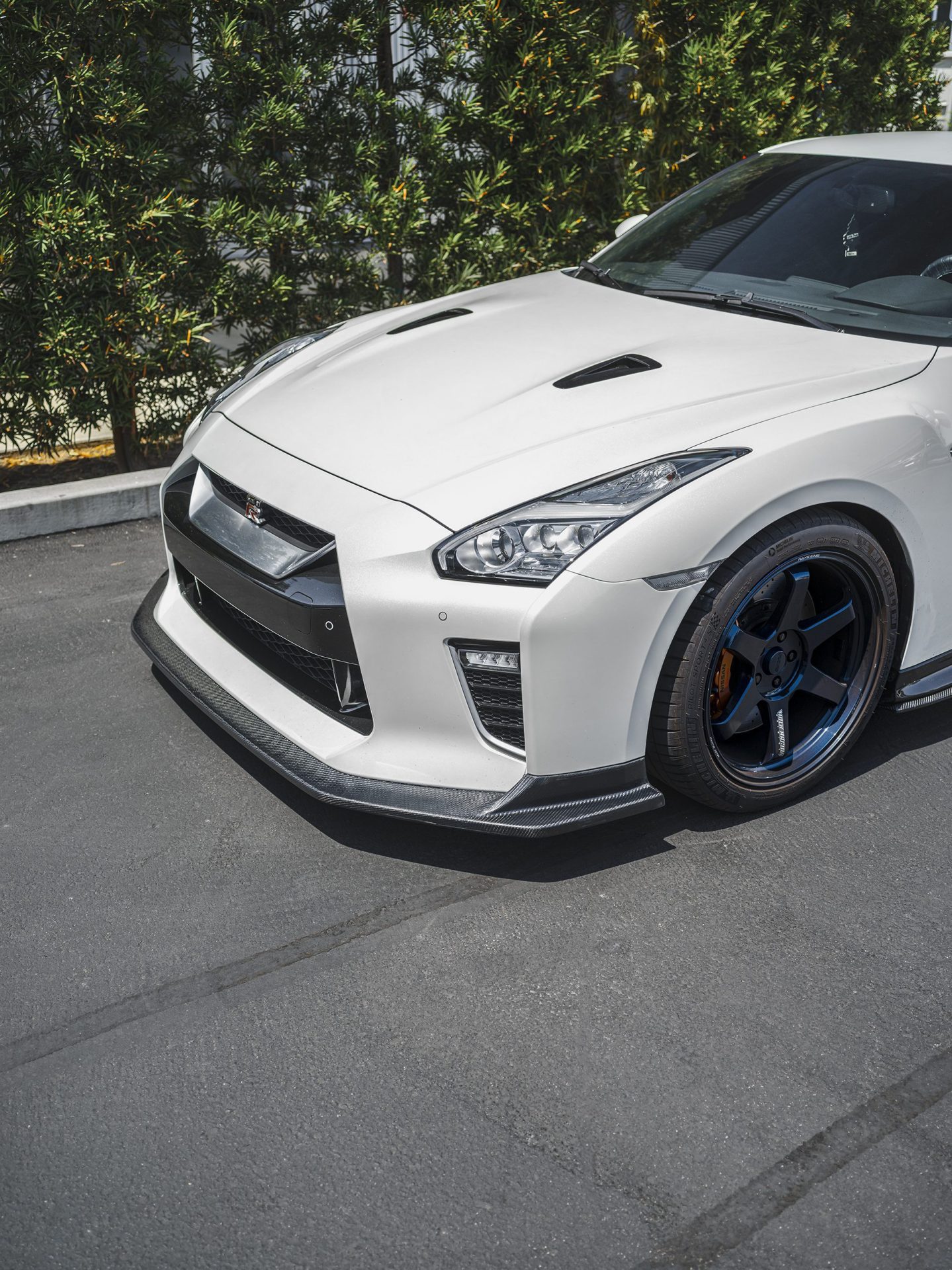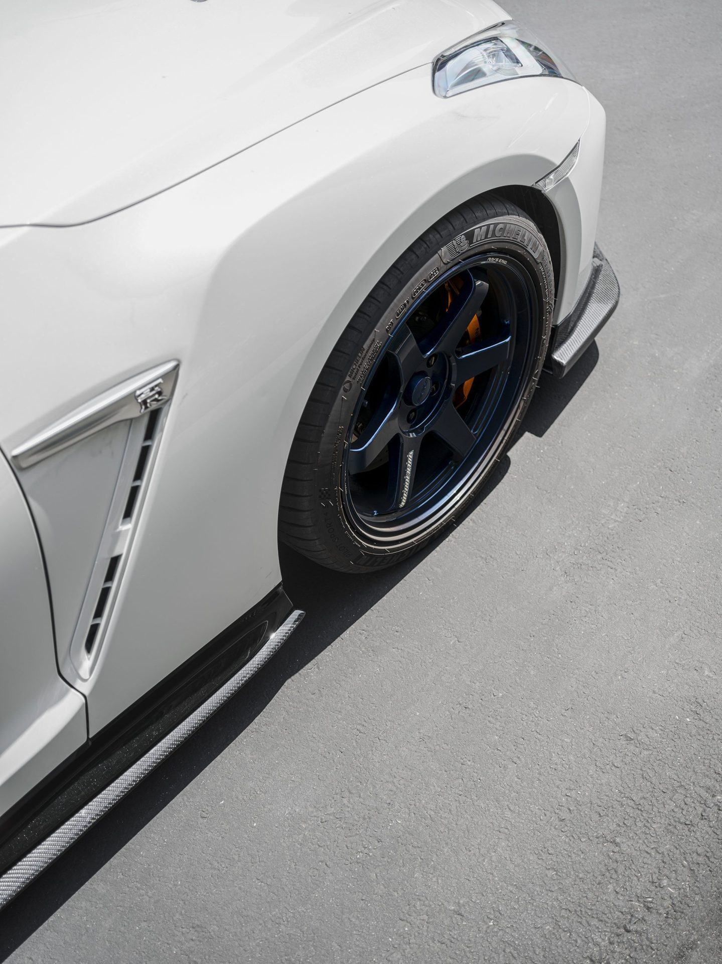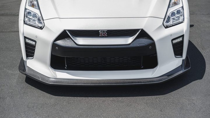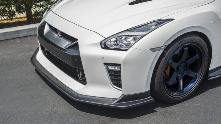 White Nissan R35 GT-R – Varis Carbon Fiber Front Lip And Side Skirts, VOLK TE37 Wheels