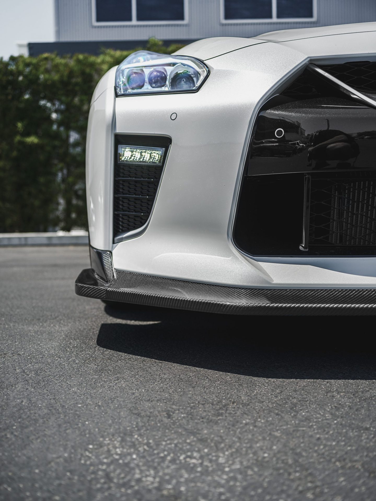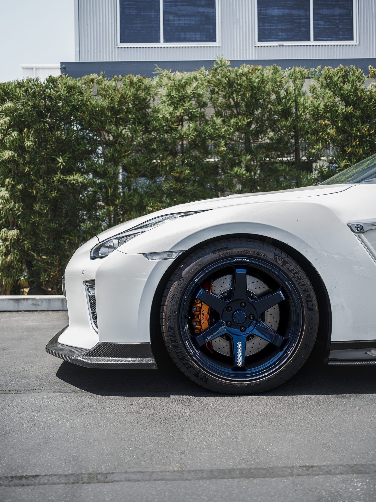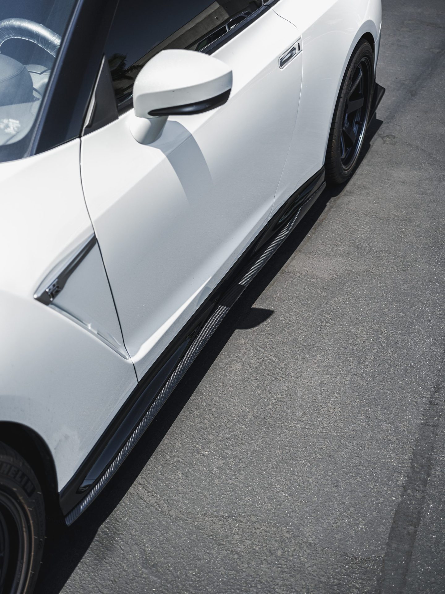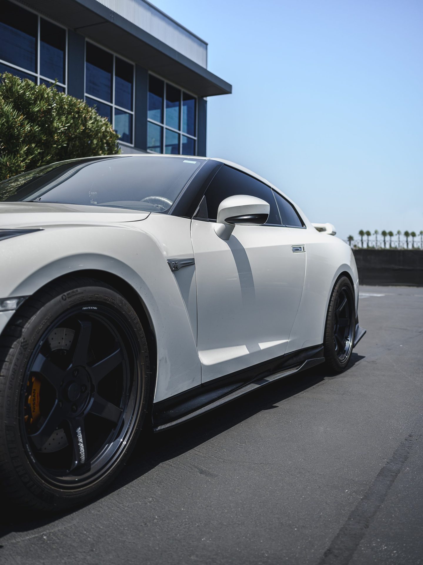 White Nissan R35 GT-R – Varis Carbon Fiber Front Lip And Side Skirts, VOLK TE37 Wheels