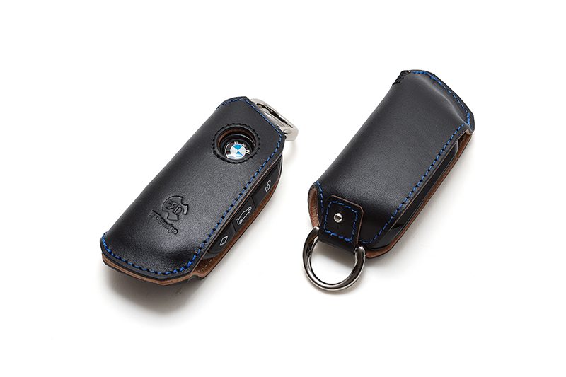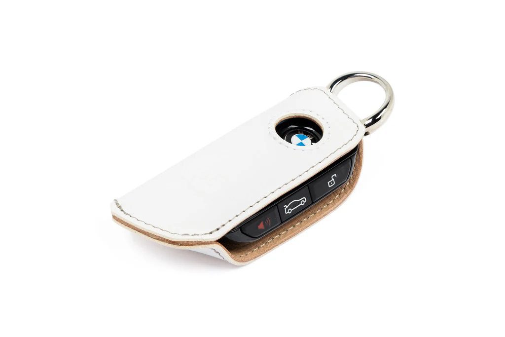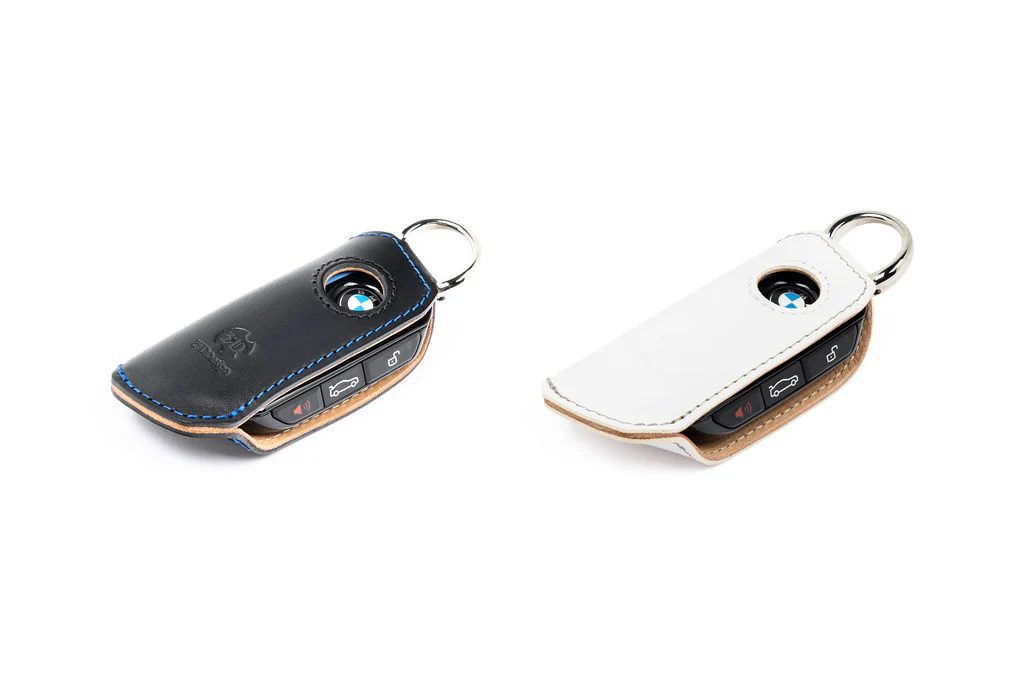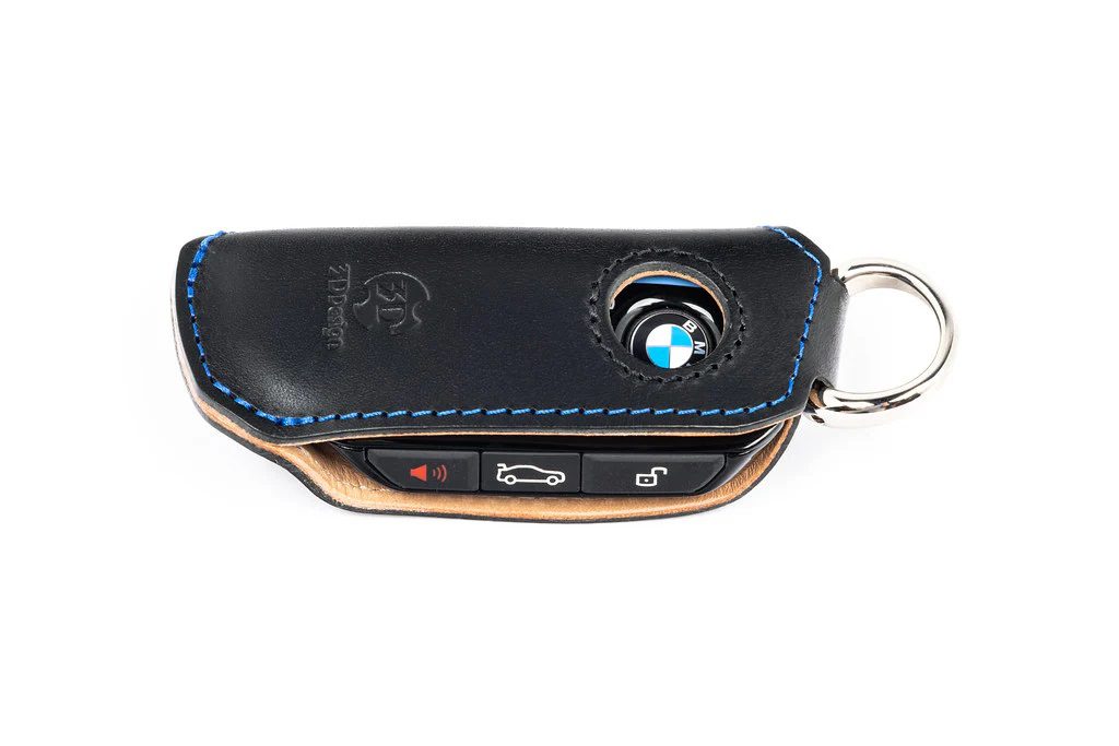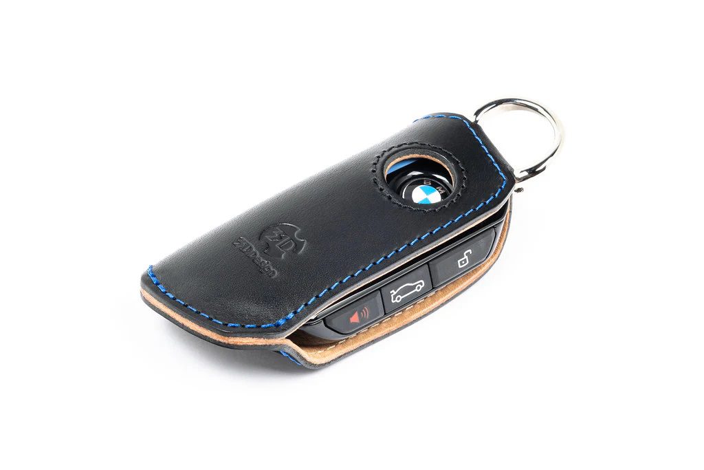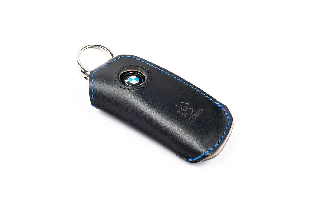 The 3DDesign D Key Case for BMW offers a refined blend of protection and style, available in Black Leather with Blue Stitching or White Leather with Grey Stitching. Designed for various BMW models, it showcases premium craftsmanship and a clean, tailored look.