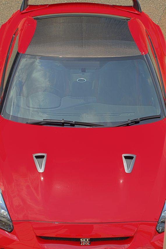 GT-R35 Dry Carbon Roof Panel The dry carbon roof panel is a carbon roof made by an autoclave method using carbon fibers equivalent to those used in the high-performance vehicle BMW M series. The specific gravity of carbon fiber is around 1.4kg and the tensile strength is equal to or higher than steel, so it is possible to make much lighter than steel with a specific gravity of 7.85kg. The dry carbon roof of this product has a tensile strength of 255 MPa or more by using five layers of carbon fiber and a plate thickness of 1.2 mm. The dry carbon roof produced in this process is 2.1kg compared to 7.0kg for the genuine panel, achieving a weight reduction of 4.9kg, while maintaining rigidity and safety equivalent to steel. With the installation of a dry carbon roof, the height of the center of gravity is lowered, and a positive effect on the moment of inertia of the roll can be expected.