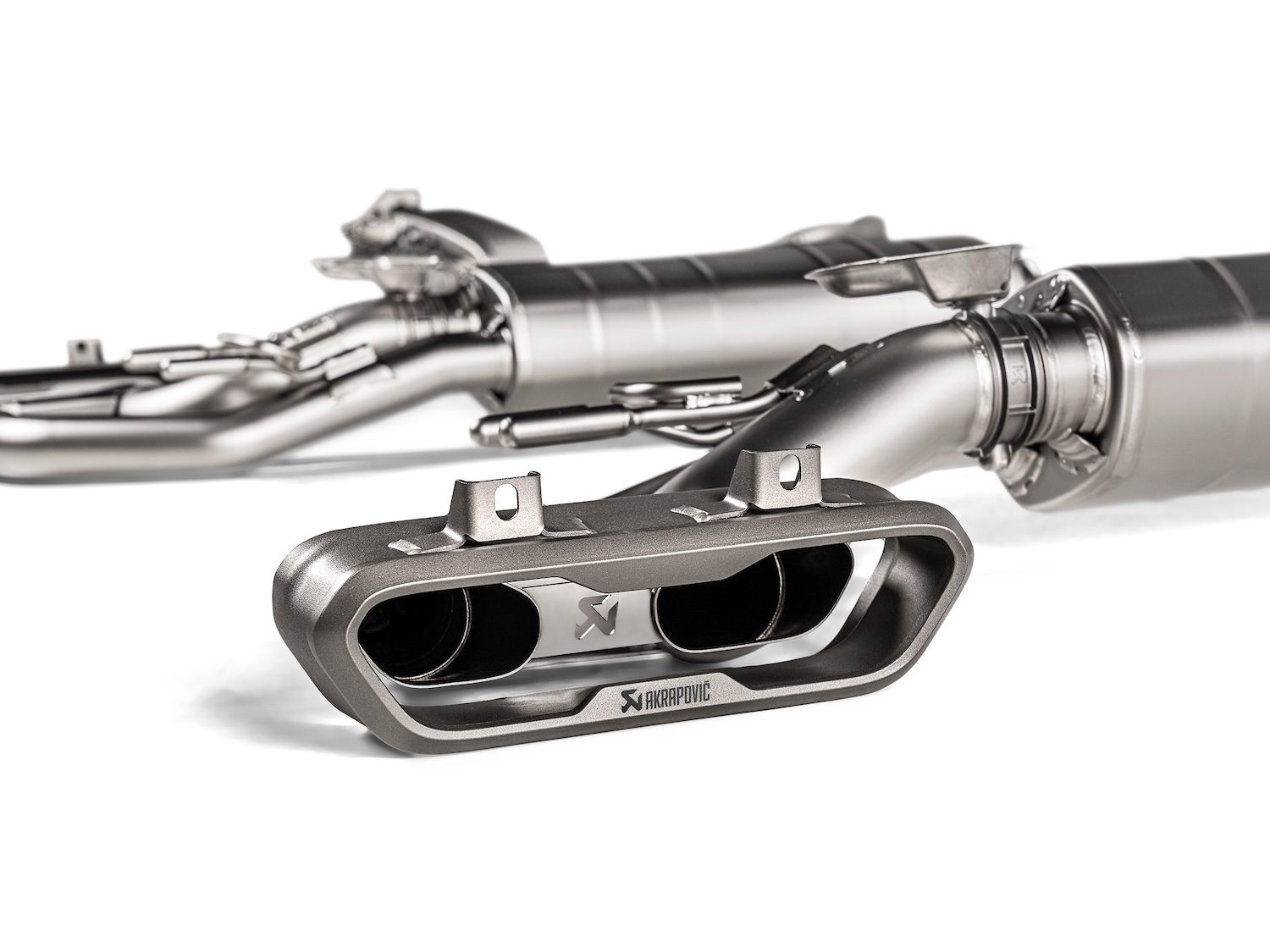 Akrapovic’s Titanium Evolution Line with titanium tailpipes for the Mercedes-AMG G 63 is engineered for both durability and performance, utilizing high-grade, lightweight titanium to achieve a 45% weight reduction compared to the stock exhaust. The system is finished with Akrapovic’s signature tailpipes, crafted in-house, exiting on either side of the vehicle to enhance its robust design and precisely fit within the limited space. Equipped with dual exhaust valves positioned behind the rear mufflers, the system delivers optimal sound control, producing a deeper, sportier tone that becomes especially pronounced during acceleration and gear changes. Power and torque are increased across the entire rpm range, and the Akrapovic Sound Kit comes included with the system.