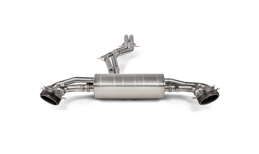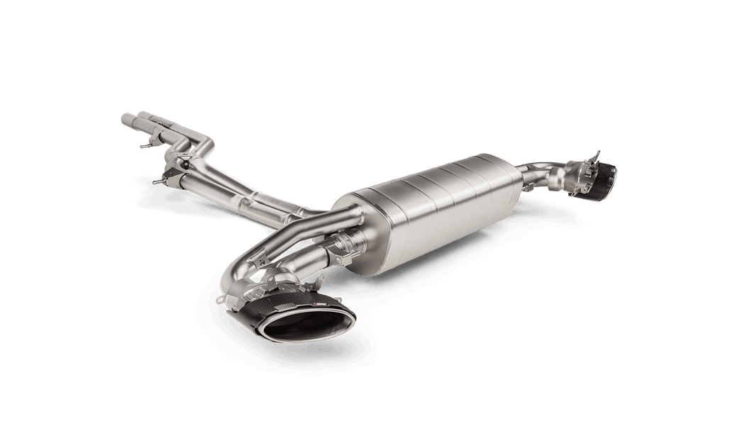 With unique sound patterns designed to offer maximum enjoyment, the X-connection in the link pipe section gives the exhaust system a characteristic Akrapovič high-frequency racing tone in the upper rev range, which is complemented by the deep and iconic Akrapovič rumble from low down in the rev range, providing a distinctive V8 growl. There also is a comfort mode, with no unwanted noise or drone in the cabin. Finished with eye-catching carbon-fiber / titanium tailpipes exiting on either side of the rear of the car.