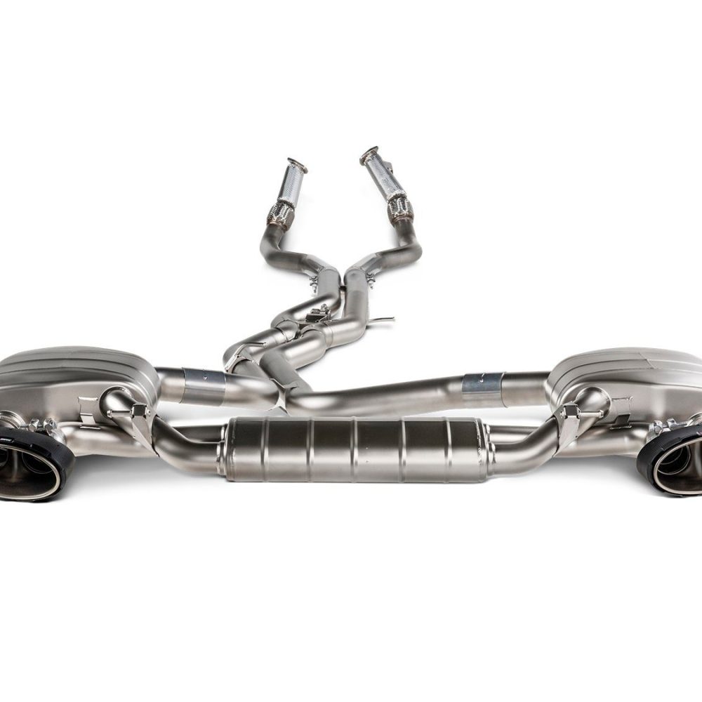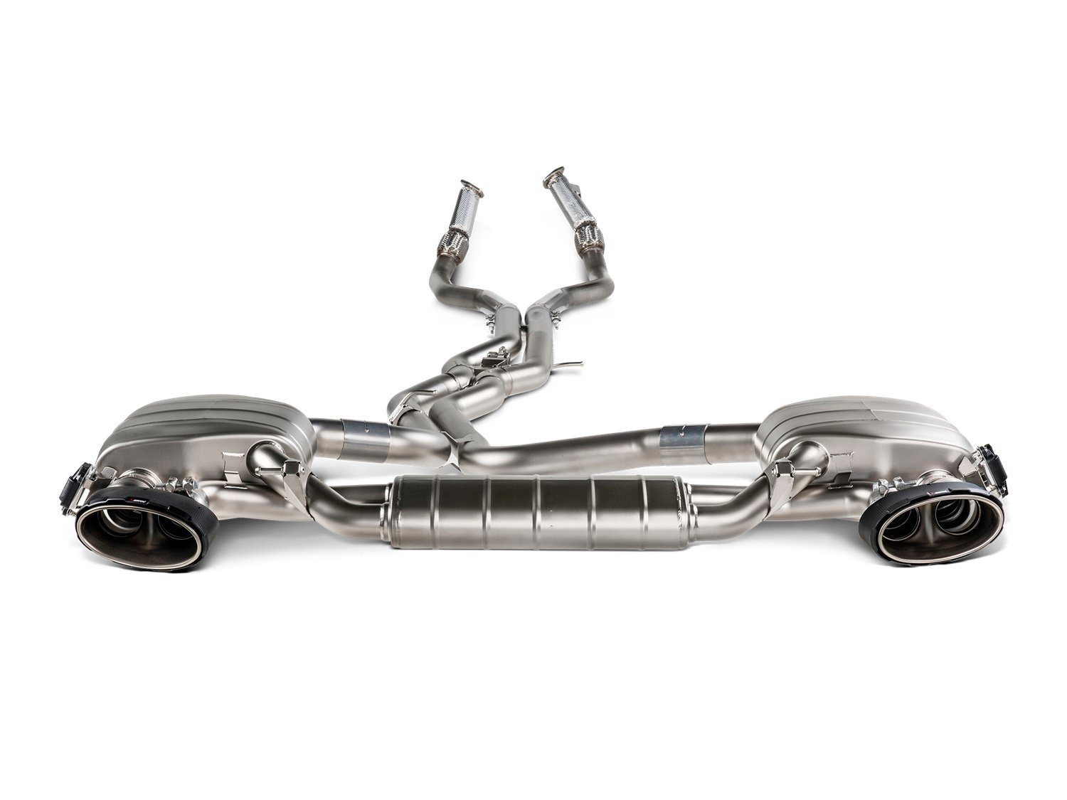 The Evolution Line Titanium Cat-Back Exhaust System, constructed from lightweight, high-grade titanium, includes a central and two side mufflers connected to larger-diameter stainless steel link pipes with custom flex tubes. Titanium valves in the side mufflers and an active X-connection optimize gas flow and produce an outstanding exhaust note. Carbon fiber and titanium tailpipes add a sporty, premium touch. Engineered for performance and acoustic excellence, the system delivers a deep rumble at low revs, a strong mid-range, and high-frequency tones influenced by Akrapovic’s racing heritage, all without unwanted drone. Testing on the C8 Audi RS 6 Avant demonstrated a 15.7hp power gain, 17.9Nm torque increase at 6150rpm, and over 20% weight reduction compared to the stock exhaust. ECE-compliant, it offers customization options, including downpipes, the Akrapovic Sound Kit, and a handmade carbon fiber rear diffuser available in high gloss or matte for enhanced visual appeal.