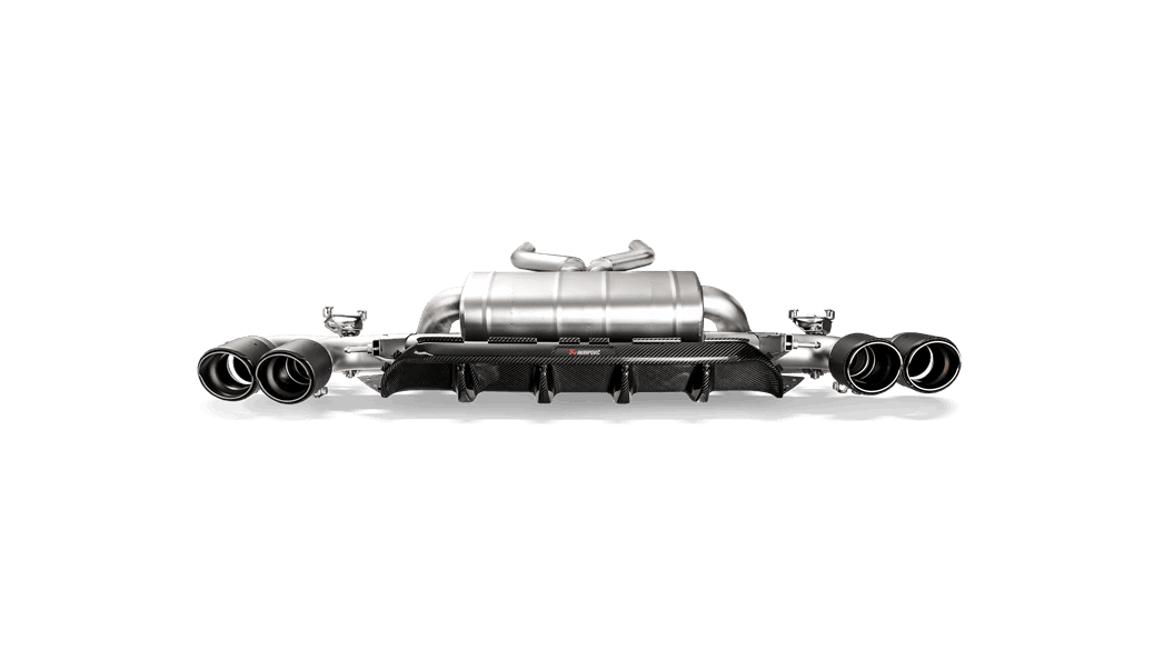 This Rear Carbon Fiber Diffuser – High Glossy, comes with red / white Akrapovič logo.