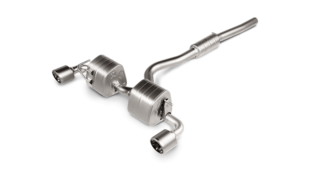 This exhaust is produced using race-proven, high-grade titanium for the entire system and features megaphone-shaped tailpipes. A collector centered between the rear resonators has been cast in the in-house foundry; this collector optimizes and balances the gas flow to produce an acoustically tuned sound with no drone. Three resonators – two at the back of the collector and one in the middle pipe – further tune the sound experience to create a sporty racing tone, fully enhancing the engine’s characteristics with a deep and enthusiastic sound, to give the occupants a feeling of exhilaration that is never interrupted by excess noise. The engineers have placed a special emphasis on the acoustics in the middle and high rev range, with a high-frequency tone at higher rpms and more sound at idle and revving. This sound is managed by two megaphone-shaped titanium tailpipes that are welded to the exhaust and specially coated to resist any color changes at high temperatures. The shape of the tailpipes influences the sound. They are bigger than stock, measuring in at 110 mm, and have a similar profile to the Akrapovič exhaust for the Toyota GR Supra. Developed to decrease back pressure, the system weighs in at 7,8 kg, which is 37 % lighter than stock and yields power gains of 9.5 kW (12.9 hp) at 6,950 rpm and torque increases of 13.0 Nm at 6,950 rpm when tested on the Akrapovič dyno against a Toyota GR Yaris with a standard stock exhaust.