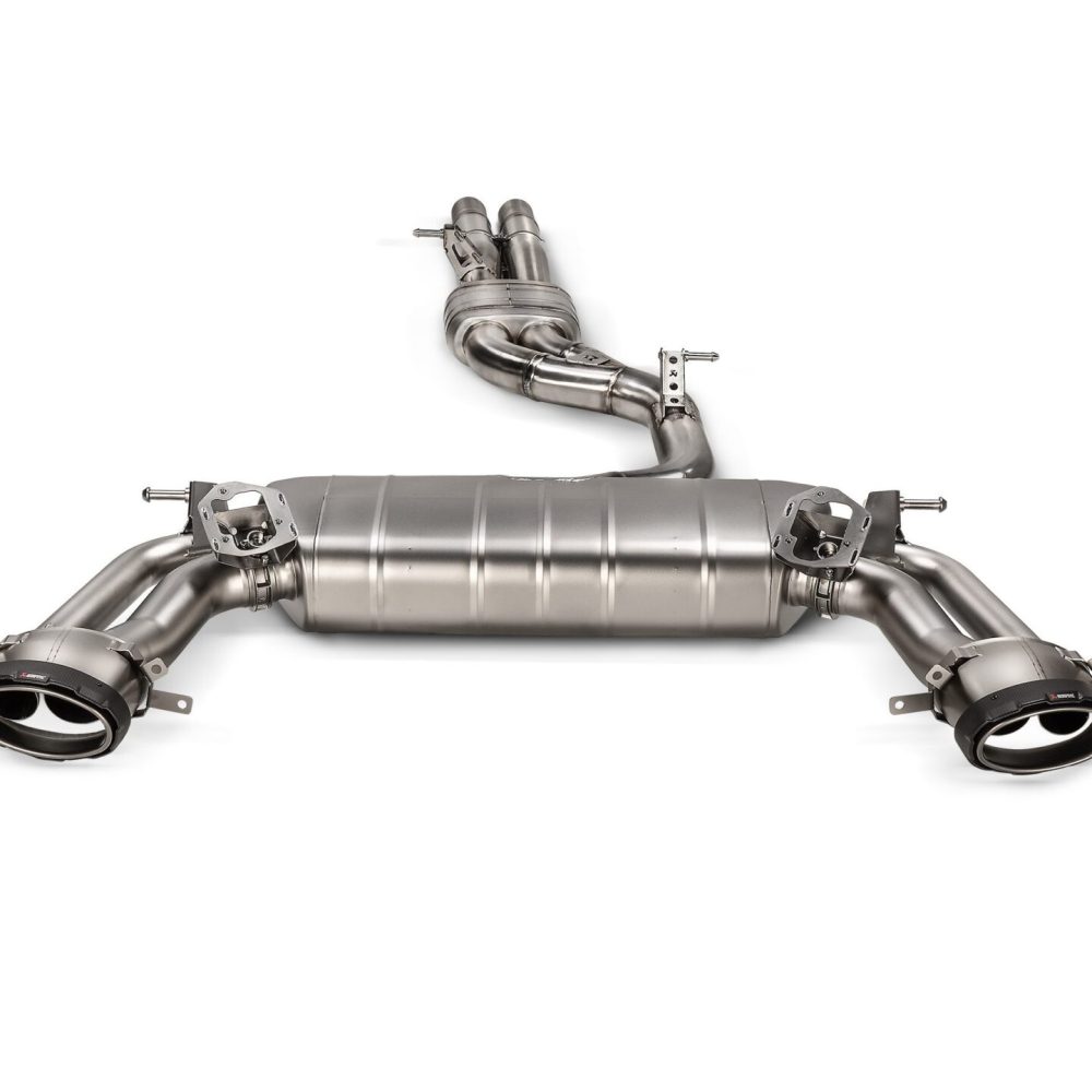 The product features titanium construction, a stainless-steel link pipe, and carbon-fiber tailpipes, reducing weight by 36.2%. It offers power gains of 7.5kW and torque increases of 8.8Nm, with sound tailored by in-house cast exhaust valve housings. The system provides a soothing tone in comfort mode and a full sound experience when accelerating. Optional upgrades include a carbon-fiber diffuser and the Akrapovic Sound Kit for sound control.