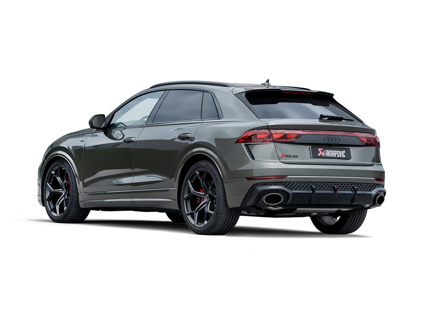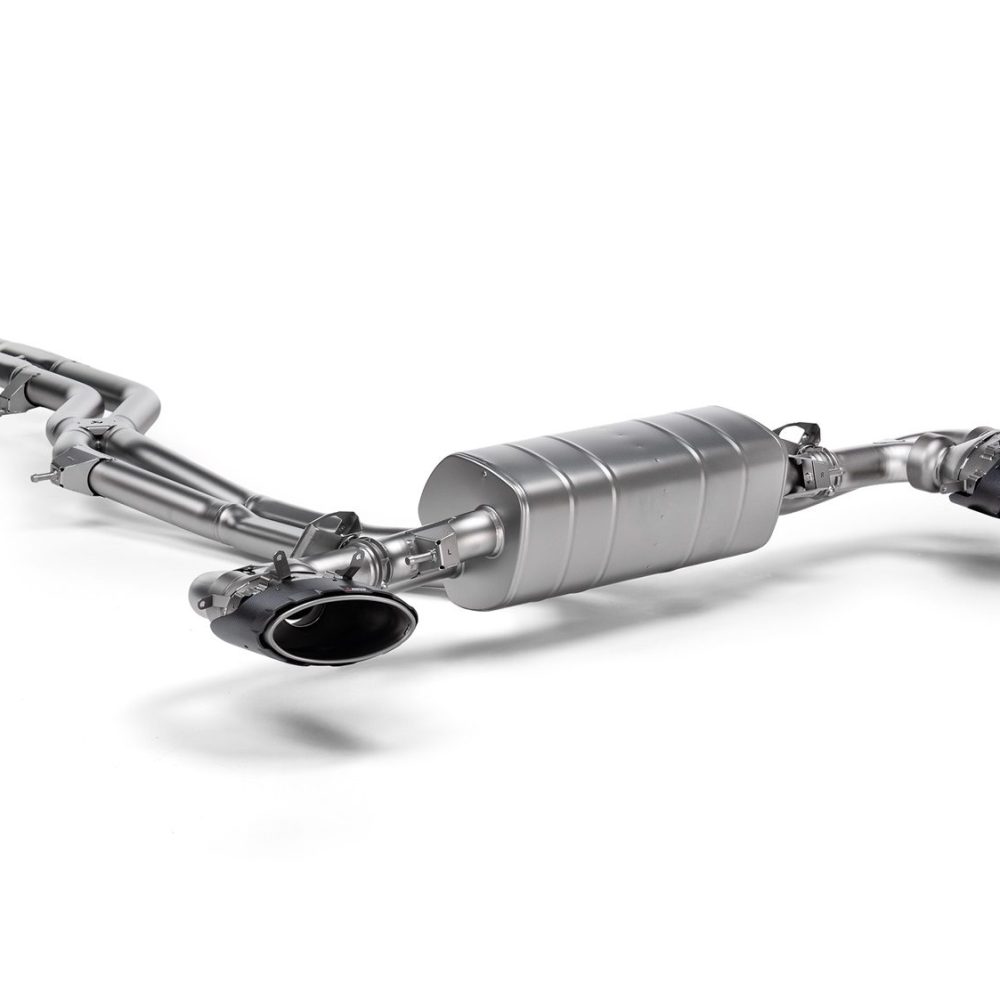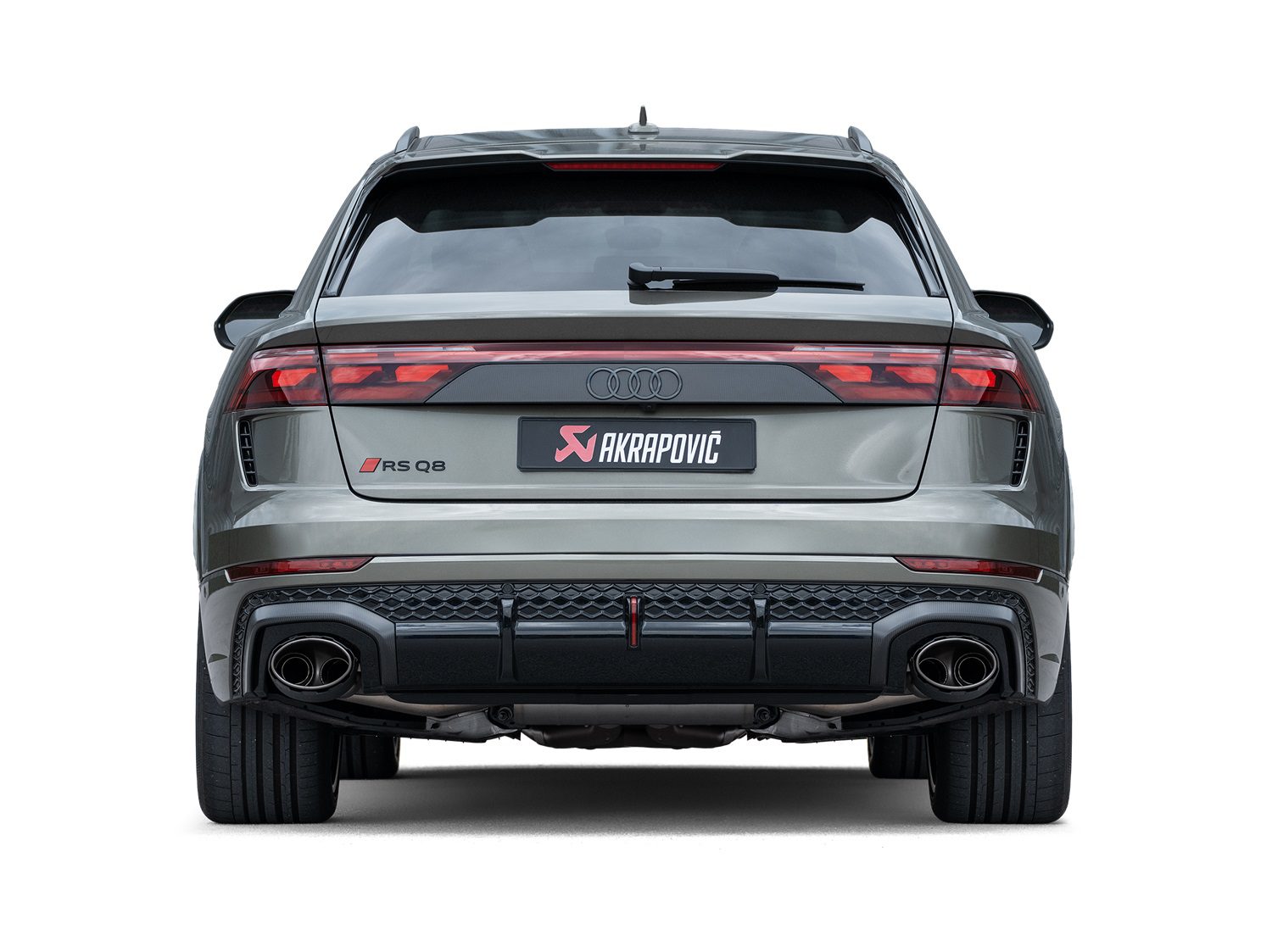 Engineered for sound and performance, this titanium exhaust system is constructed entirely from lightweight, high-grade titanium and features a central muffler flanked by two valves, with housings cast in Akrapovič’s in-house foundry. As the rear section of the system, it requires the link-pipe set featuring an X-connection to operate. The design delivers a signature high-frequency racing tone at higher revs, complemented by a deep, iconic V8 rumble at low rpm, while a comfort mode eliminates unwanted cabin drone. Finished with carbon and titanium tailpipes on both sides, it achieved gains of 7.6hp at 6,200rpm and 7.4lb-ft at 2,850rpm in Akrapovič back-to-back dyno testing against the RS Sport exhaust on the RS Q8. It installs as a plug-and-play unit and, with ECE type approval, requires no ECU tuning.