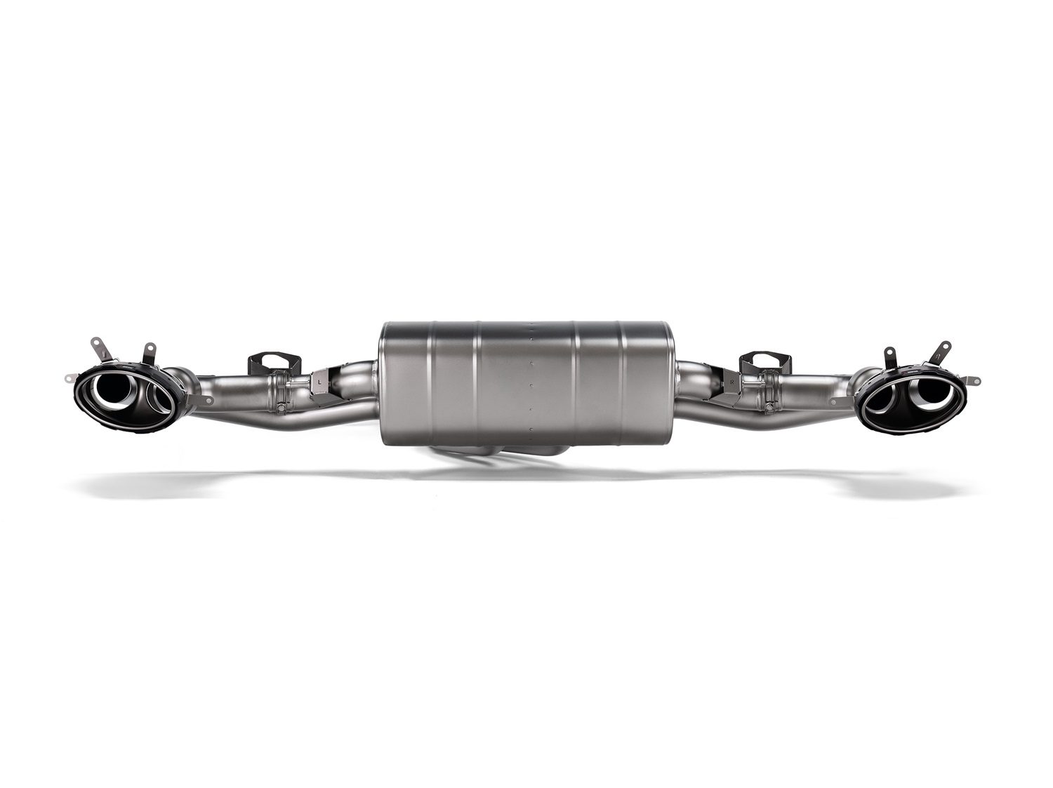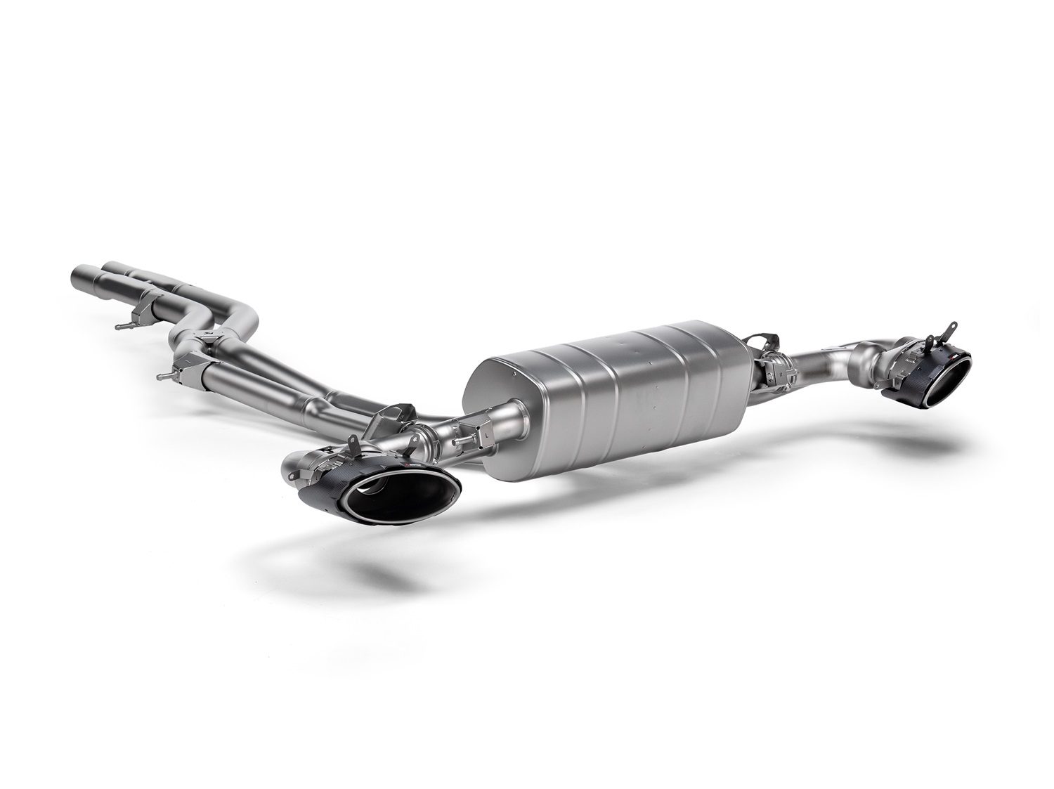 Full-titanium rear section with twin valves—requiring the X-connection link-pipe — delivers a high-frequency racing tone at high rpm and a deep V8 rumble at low, with a comfort mode that eliminates cabin drone. Finished with carbon/titanium tips, it installs plug-and-play and carries ECE approval, requiring no ECU tuning.