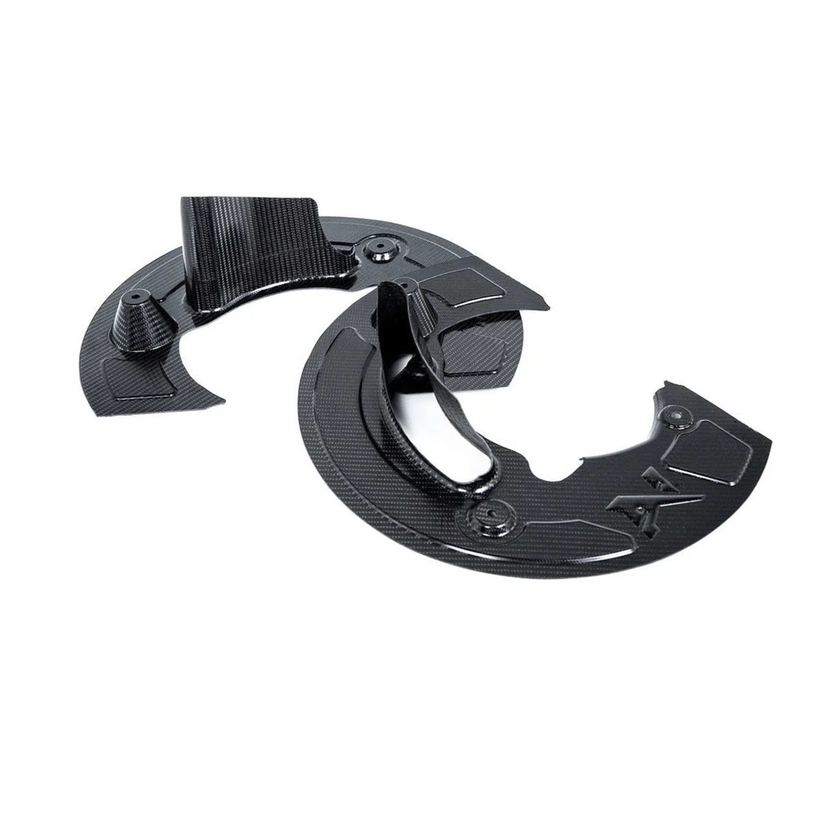 Enhance brake cooling without the need for cumbersome hoses and zip-ties. Alpha-N’s carbon fiber brake duct shield set (2 pieces: left and right) for the G8x M2 / M3 / M4 front brakes features an integrated scoop and duct that captures and channels air from the factory brake ducts directly into the rotor hat, optimizing airflow through the rotor vanes for maximum cooling efficiency.