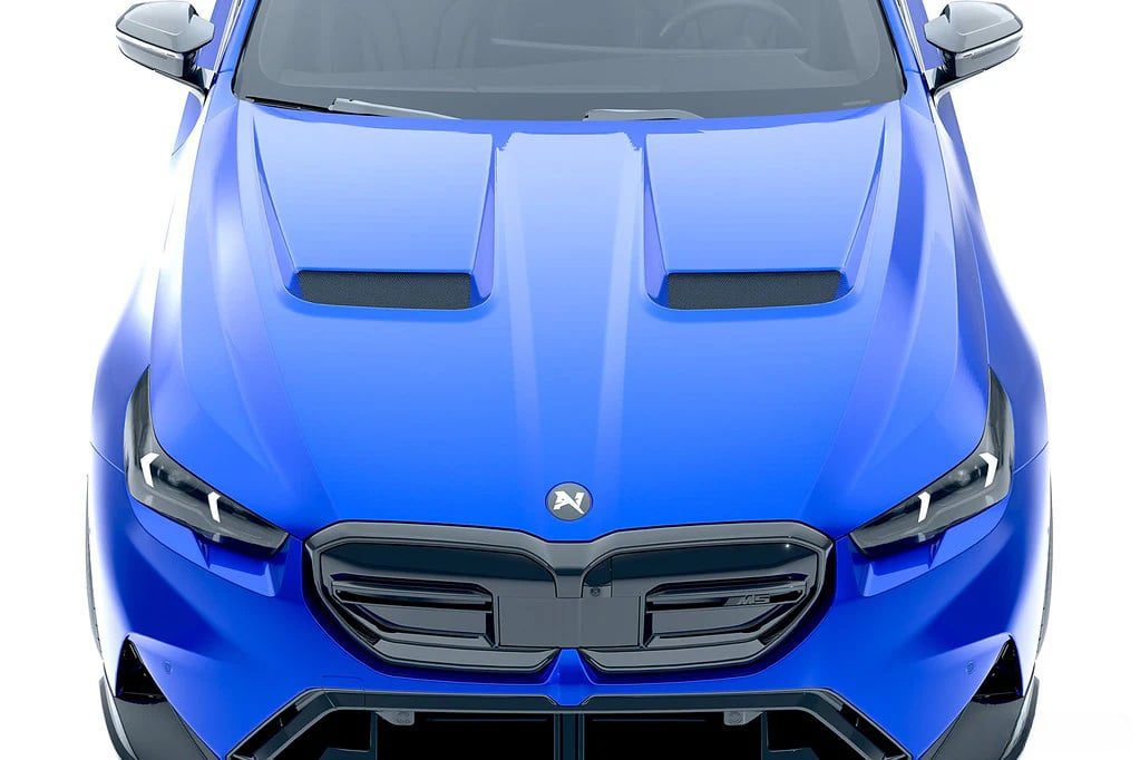 • At the front, Alpha-N introduces a carbon hood constructed entirely from pre-preg carbon fiber with integrated skeletal bracing for superior stability and lightweight performance. Similar in concept to their G8X M3 / M4 vented hood, the G9X M5 hood features a fresh design with larger, strategically positioned air outlets for enhanced thermal management and aerodynamics, drawing inspiration from BMW Motorsport’s M4 GT3.