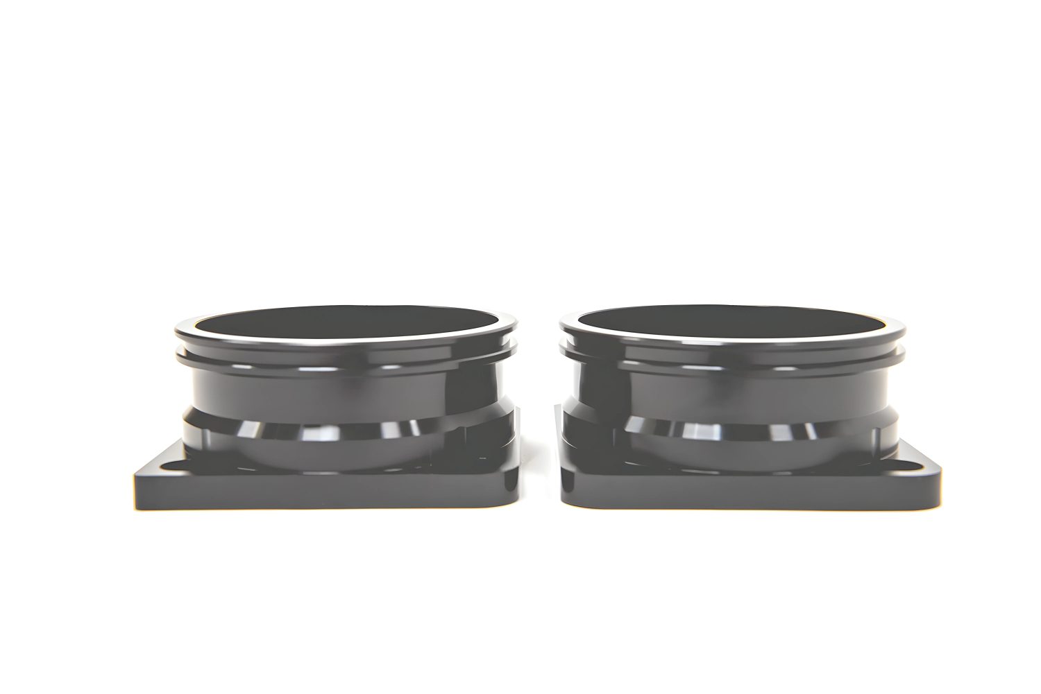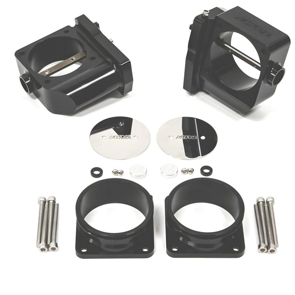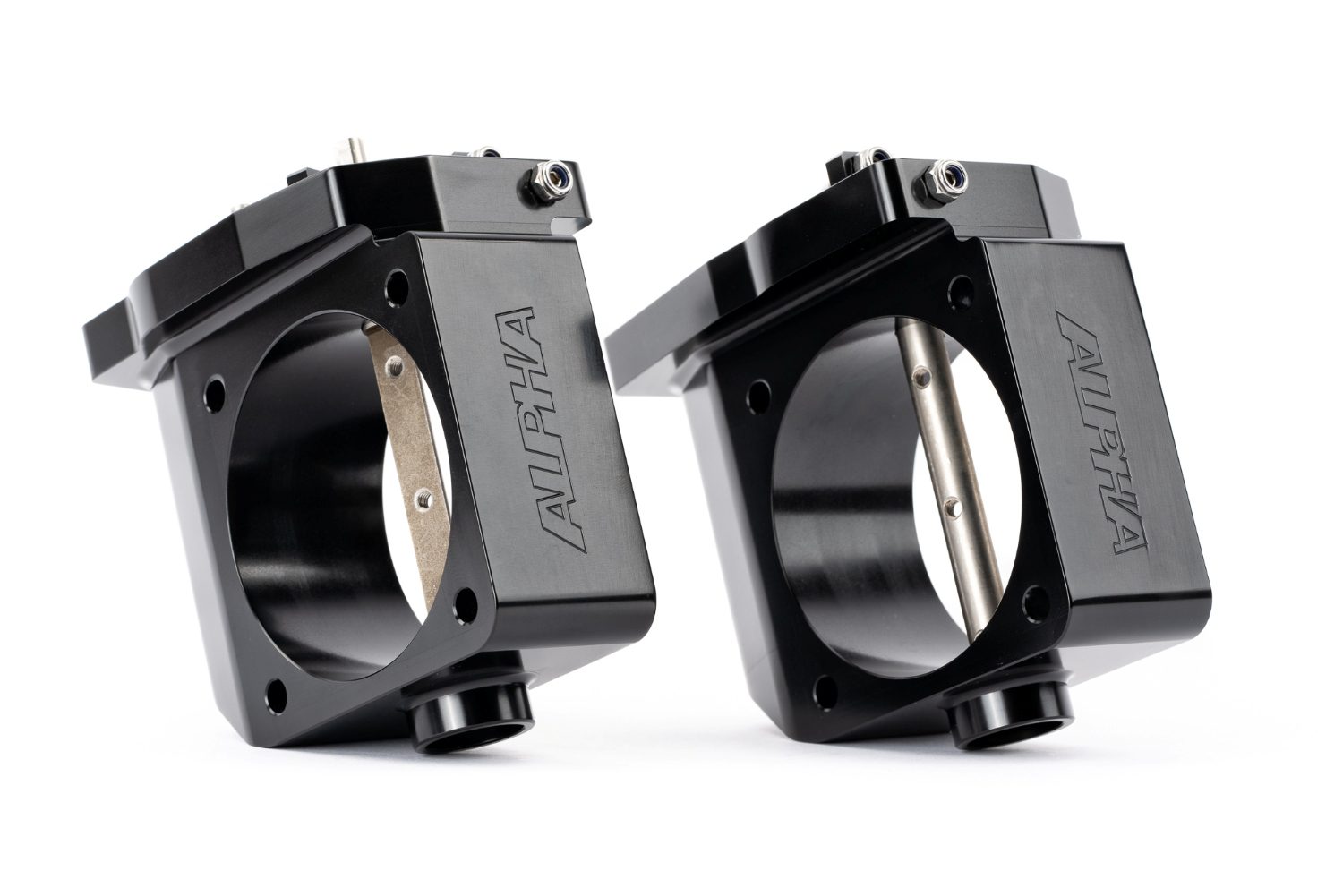 The AMS Performance Billet Big Bore Throttle Body Set with Vibrant HD Flanges for the R35 Nissan GT-R is engineered to improve airflow and throttle response in high-horsepower applications significantly. Precision-machined from billet aluminum, these throttle bodies offer increased bore size for enhanced intake flow, supporting greater power potential and sharper throttle control. Designed as a direct upgrade, they feature durable, vibrant HD flanges for secure, leak-free connections under extreme boost conditions. Ideal for serious performance builds, this throttle body set delivers the reliability and performance expected from the AMS Alpha product line.