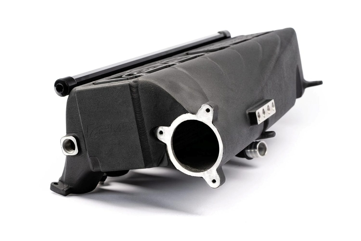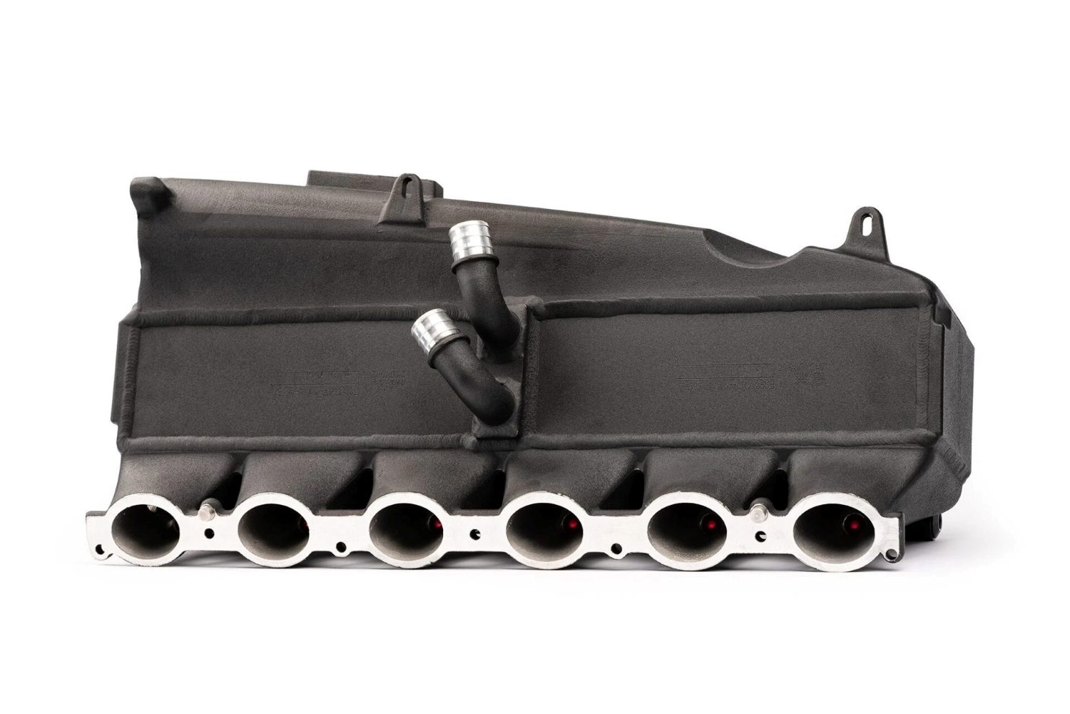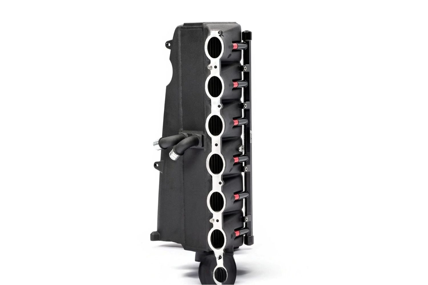 The AMS Performance Intake Manifold for the 2020+ Toyota GR Supra features a twin core design for superior cooling and includes a flush-mounted -8AN fuel rail for efficient auxiliary port fuel injection, enhancing both performance and reliability.