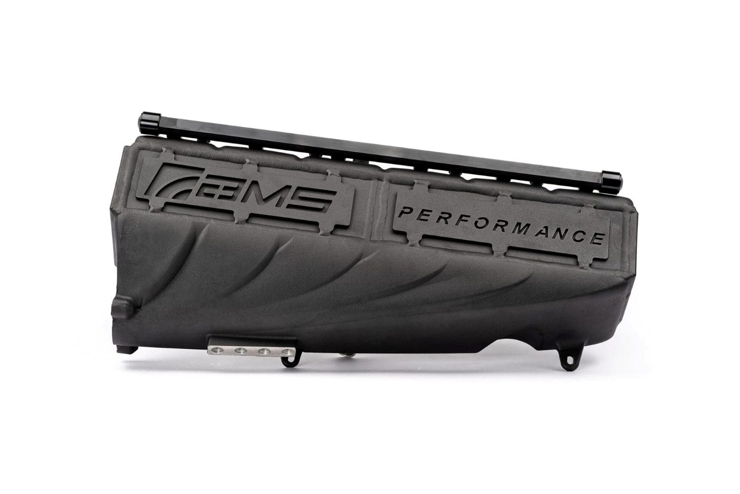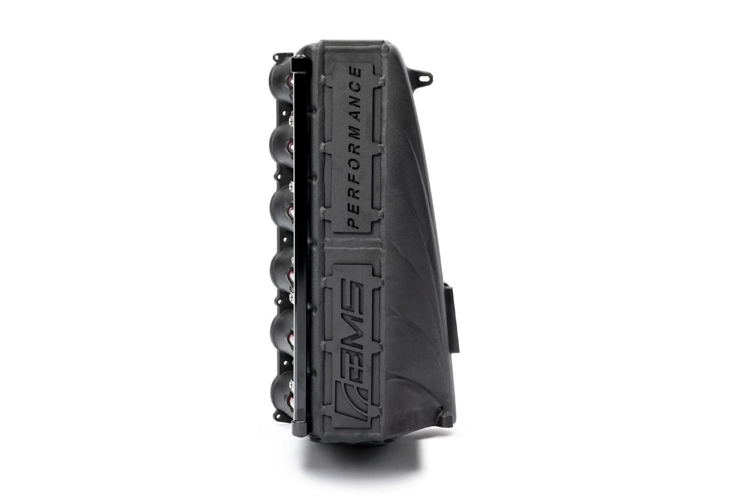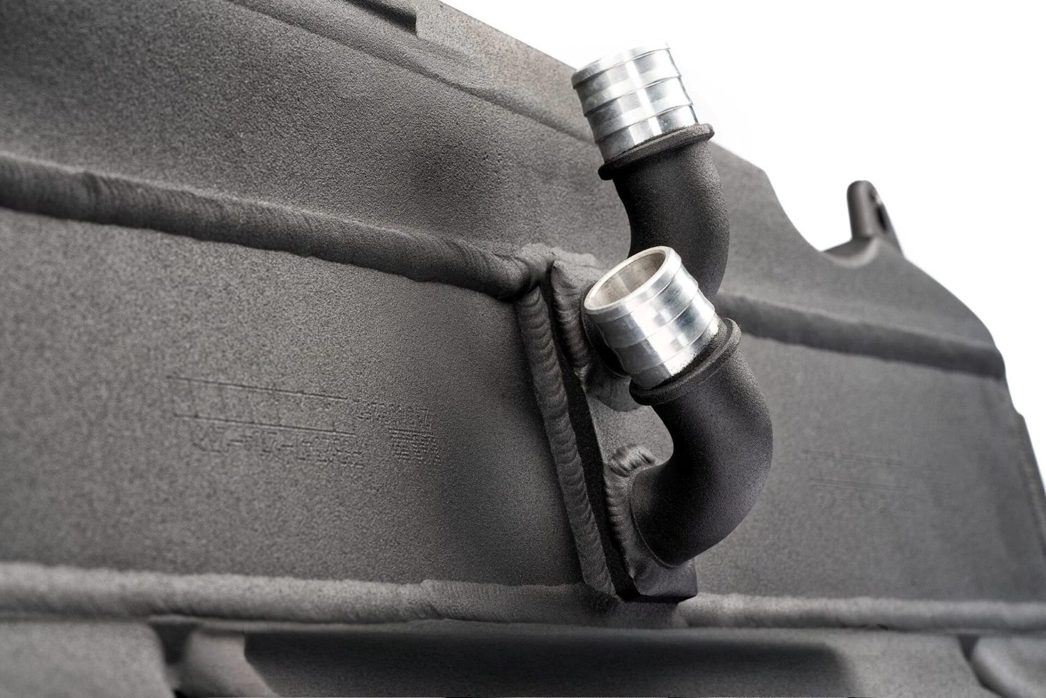 The AMS Performance Intake Manifold for the 2020+ Toyota GR Supra features a twin core design for superior cooling and includes a flush-mounted -8AN fuel rail for efficient auxiliary port fuel injection, enhancing both performance and reliability.