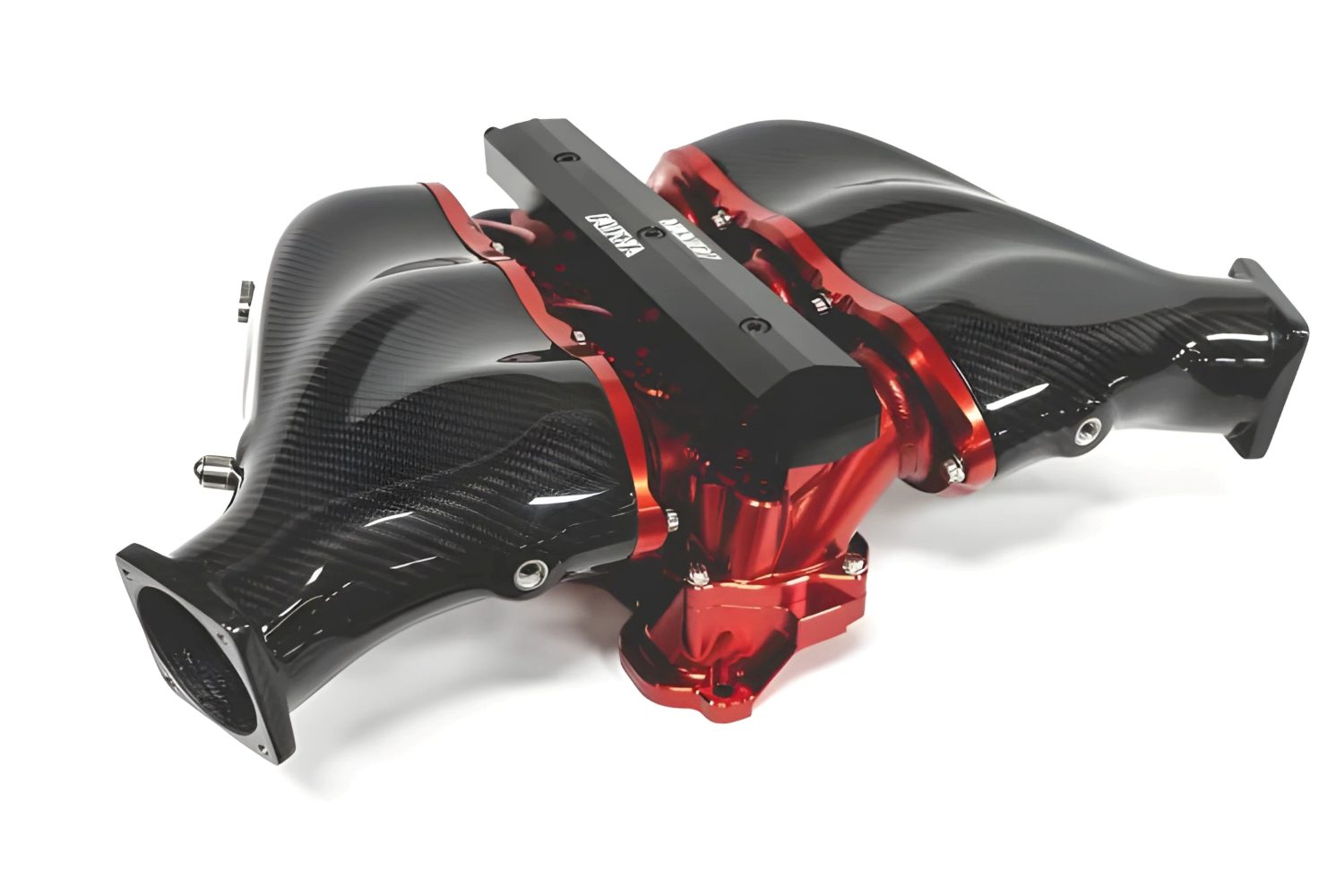 The Alpha 18-injector R35 GT-R Intake Manifold by AMS is a high-performance carbon fiber solution designed for maximum efficiency and power, supporting advanced fuel setups (injectors not included).