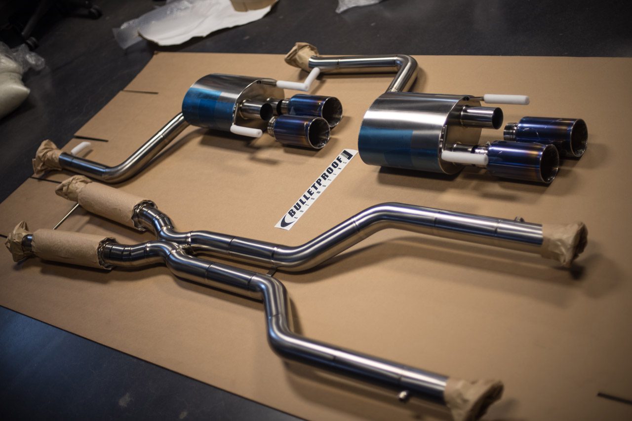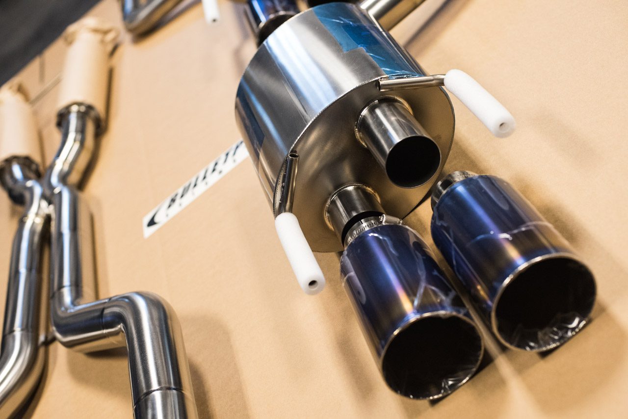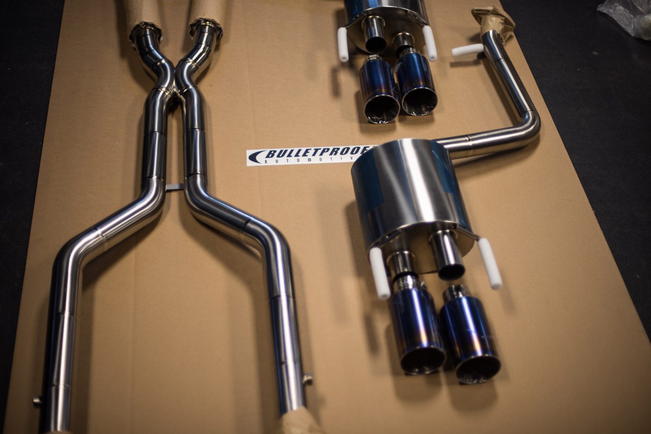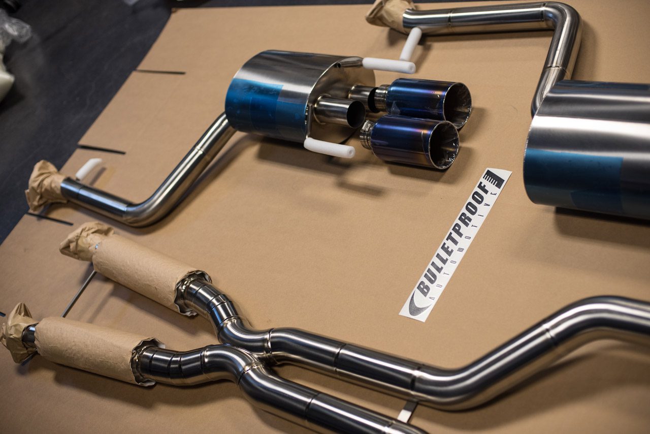 Exclusive from Bulletproof Automotive is the “Race Version” exhaust system which does not include resonators for improved sound. A “Street Version” is also available, which has improved flow over the factory exhaust system, but a minimal increase in sound. We recommend “Race Version” to achieve the best sounding RC-F, as the Street Version is a bit too quiet for most RC-F owners’ tastes. At idle the Race Version system sounds close to stock levels. However, on throttle, it really opens up and sounds very aggressive.