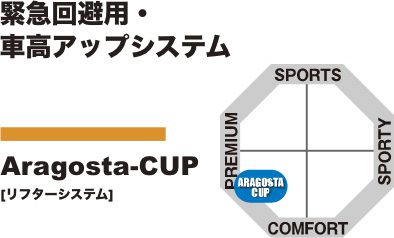 This is an innovative system that makes it possible to avoid interference between the body and the road surface, which is a concern on very low vehicles. Speed bumps, entrances and exits of parking lots are no longer a concern. The Cup System raises the vehicle height in a short time with a single compact switch from the driver’s seat.