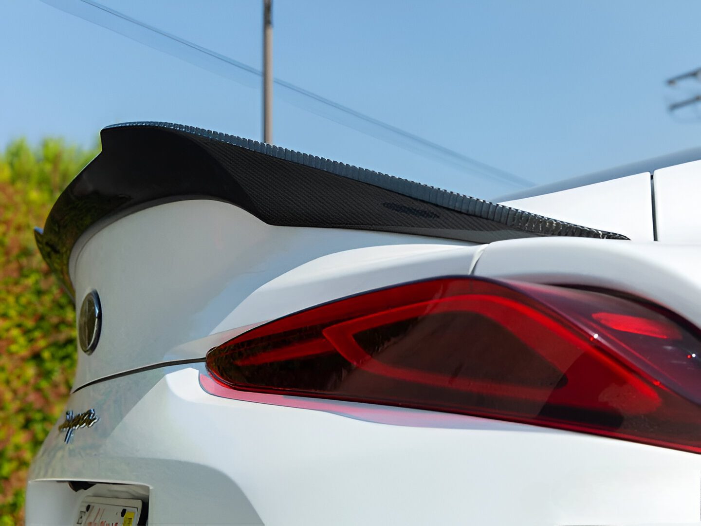 The AutoTecknic Dry Competizione Trunk Spoiler for the A90 Supra stands as one of the most sought-after spoilers among Supra owners. Constructed from lightweight carbon fiber using an autoclave pre-preg vacuumed forming process, this spoiler offers superior strength and rigidity. AutoTecknic’s brand new original design provides the A90 Supra with a more aggressive rear appearance, fulfilling the desires of many enthusiasts. The spoiler is crafted entirely from 100% carbon fiber and features a glossy finish, enhancing the visual appeal of the vehicle. Before release, each new product from AutoTecknic undergoes rigorous testing and quality control to ensure it meets high standards. The installation process is straightforward and user-friendly; simply clean the trunk’s surface, apply double-sided tape to the underside of the spoiler, and it is ready to be installed. Requiring no drilling, the installation can be completed in no more than 20 minutes, making it an efficient upgrade for enhancing the car’s aesthetics and performance.