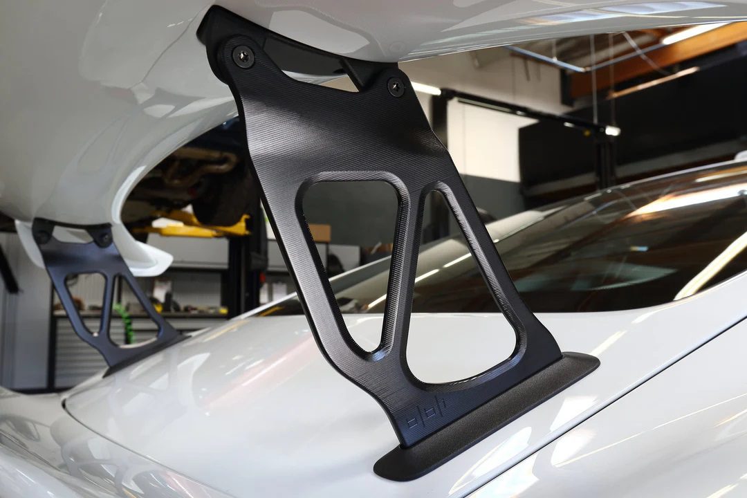 The highly anticipated BBI Autosport Porsche Cayman GT4 Extended Wing Supports, direct bolt-on parts, elevate the factory wing by 80mm into cleaner air. These components are CNC machined from 6061-T6 billet aluminum and are beautifully contoured to appear as if they were original factory components rather than aftermarket additions.