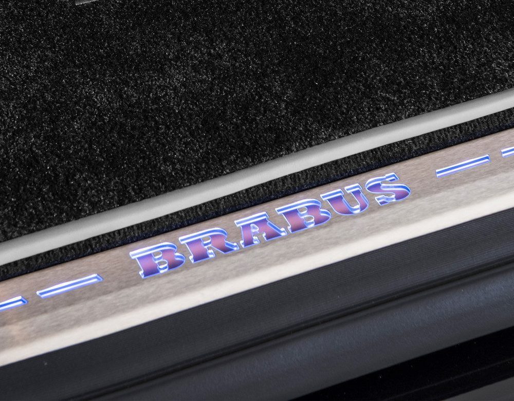 Gracing the rear door is a meticulously crafted BRABUS scuff plate, fashioned from gleaming stainless steel and securely mounted on a high-grade plastic support. The BRABUS logo, illuminated by LEDs, casts a captivating glow, seamlessly blending with the ambient lighting in up to 64 distinct colors. This subtle yet elegant touch elevates the vehicle’s aesthetic appeal, leaving a lasting impression on every passenger.