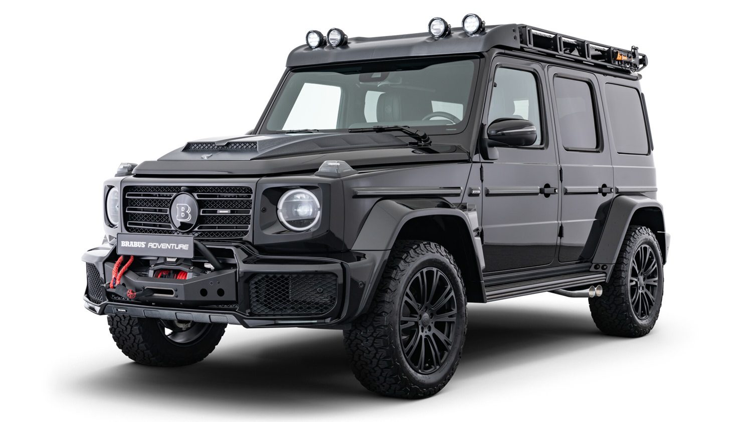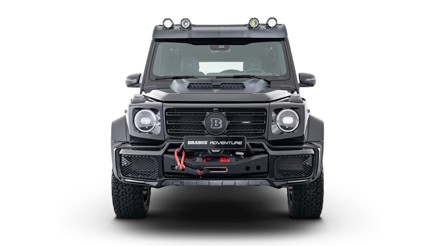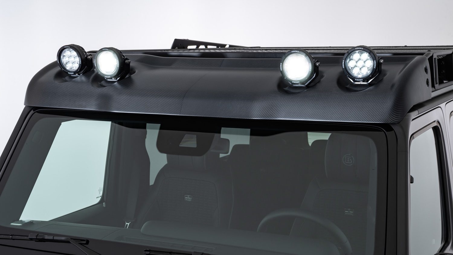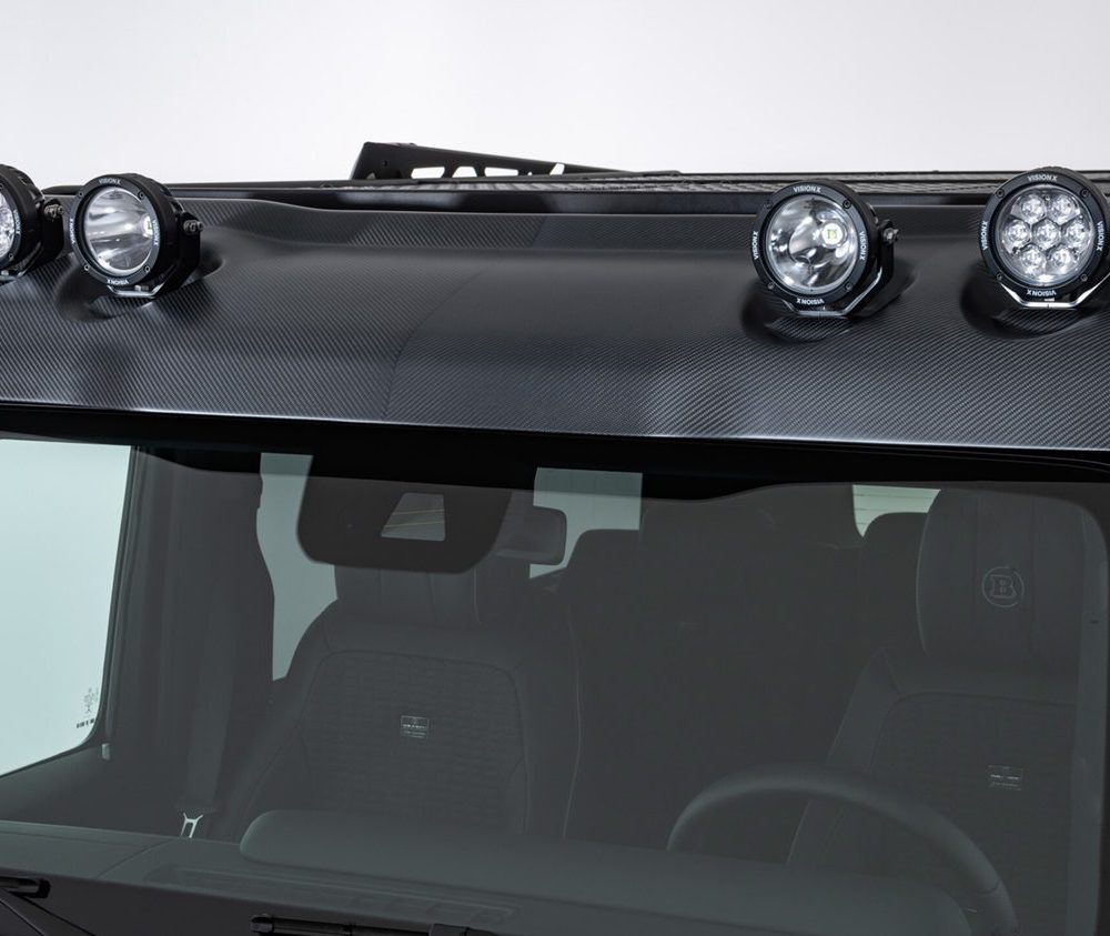 BRABUS’ carbon fiber Front Roof Wind Deflector for the Mercedes-AMG G63 enhances style and visibility with four integrated LED headlamps, including high beams and work lights. Designed for durability, it withstands harsh conditions while complementing the vehicle’s rugged look.