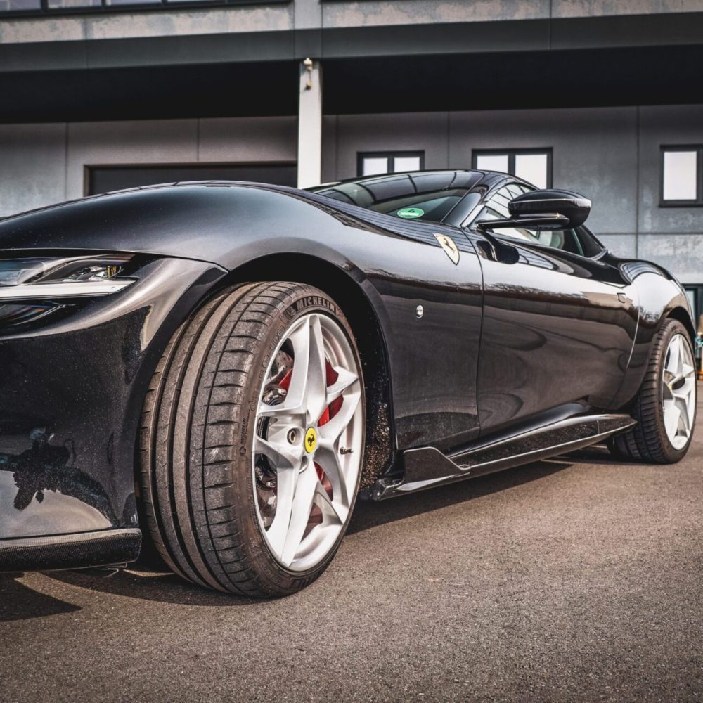 Capristo aimed for the Ferrari Roma front conversion to create a design that merges smoothly with the vehicles inherent style, preserving its original contours and visual appeal. Their goal was to enhance the car’s sophisticated and smooth lines with the addition of traditionally inspired Ferrari Side Skirts.