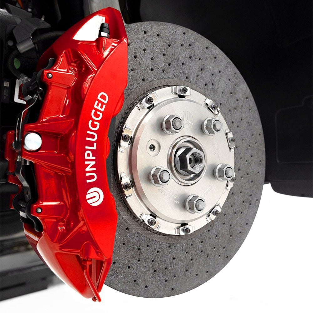 An additional benefit of carbon-ceramic rotors is their considerably lower unsprung weight as opposed to traditional iron units. “Unsprung weight” refers to the weight of any component, not on the receiving end of the vehicle’s suspension system (chassis, motors, passengers, etc.). Lower unsprung weight translates to a reduction in the amount of inertia for the components managed by the suspension, which in turn leads to a more responsive ride and more agile handling feel. Additionally, reductions to the overall weight of the vehicle help to improve range and efficiency.