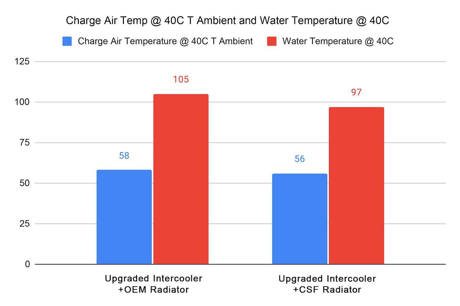 • Testing of the CSF FE1 Civic Si Radiator against the OE Civic Si radiator has not yet been conducted. However, CSF has tested the FL5 Civic Type R Radiator, which features the same core design as the FE1 Civic Si Radiator. Since the factory Civic Type R radiator is more efficient than the factory Civic Si radiator, the performance improvements with the CSF radiator for the Civic Si are expected to be even more significant. During testing, the FL5 Civic Type R Factory Radiator was compared to the CSF Radiator on a FL5 vehicle tuned to 294 whp and equipped with a larger, upgraded front mount intercooler. This intercooler is known to increase engine coolant temperatures by approximately 7% due to airflow restriction over the radiator. Results showed that the CSF Radiator reduced engine coolant temperatures by 8°C compared to the OEM radiator. These findings highlight the importance of a radiator upgrade, especially for vehicles running larger intercoolers or for those intended for track use. The CSF Radiator provides a significant cooling advantage, improving thermal management and overall engine performance.