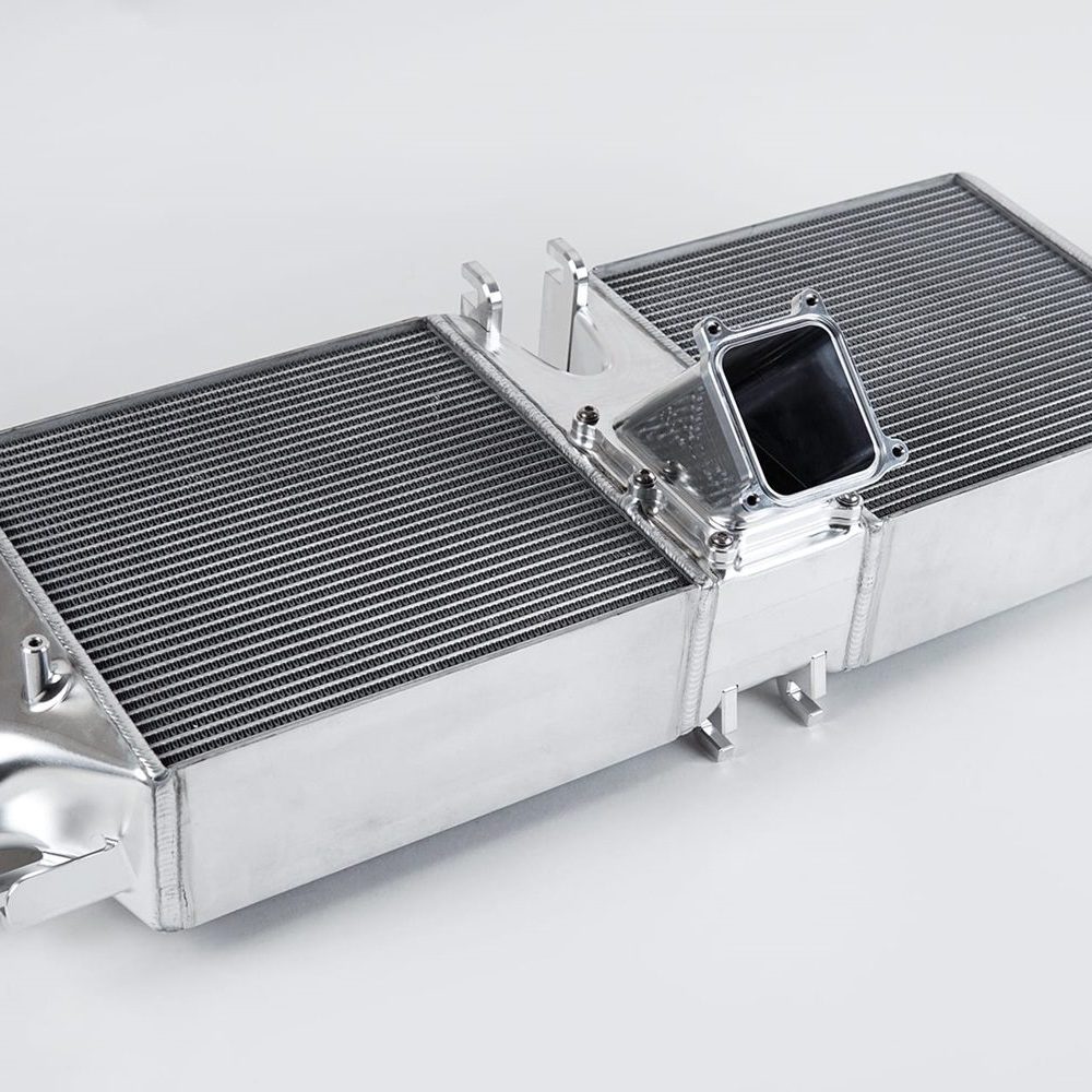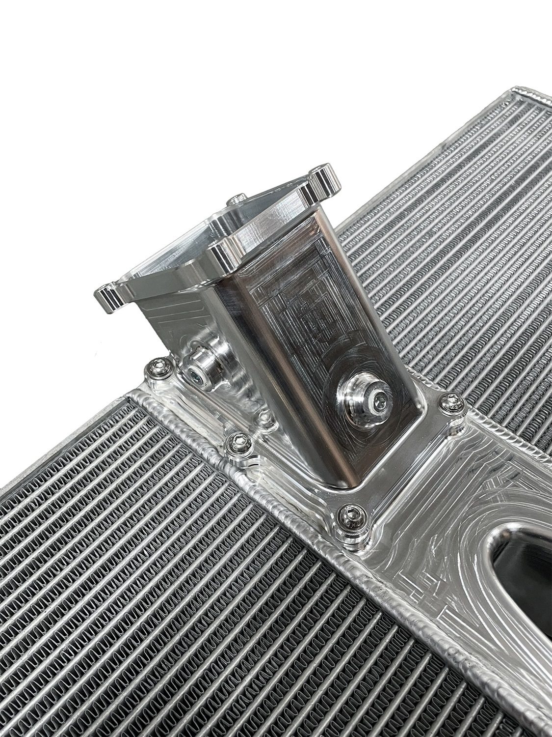 • CNC-machined billet end tanks with integrated Y-pipe connection to throttle body