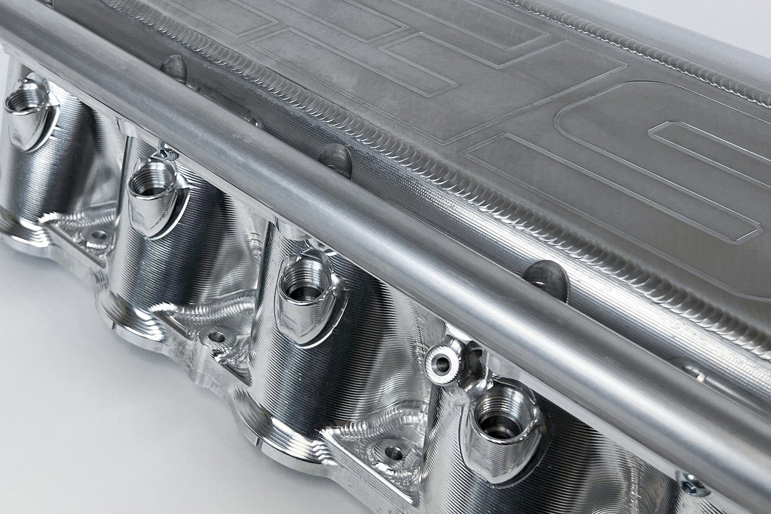 • The CSF Manifold is equipped with an integrated extruded fuel rail mounted on the outlet side. This AN-8 fuel rail includes a -8 internal hex plug fitting, offering compatibility with both returnless and full-loop fuel system configurations. Each cylinder’s fuel rail aperture features a 7mm opening, optimized for compatibility with most high-performance injectors. For best performance, CSF recommends Injector Dynamics (ID) injectors, the most commonly used for this engine. The supplied hardware kit includes anodized CNC-machined injector hats (quantity 6) designed to accommodate short-height injectors, commonly referred to as “shorties.”