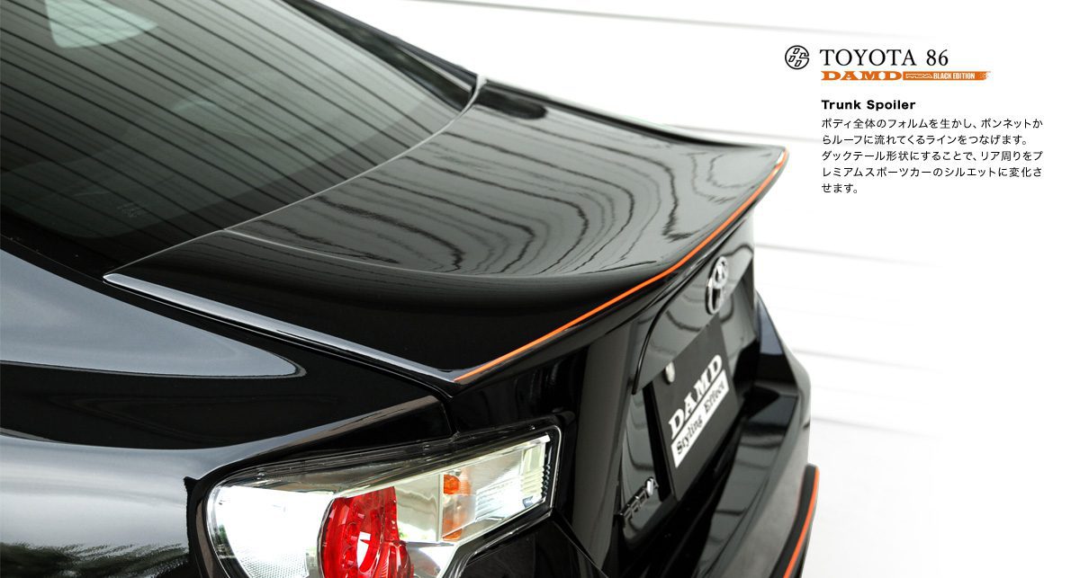The trunk spoiler is designed and manufactured specifically for the Toyota GT86. This product gives a unique appearance to the rear of the car. This trunk spoiler fits on OEM or OEM stye trunks.