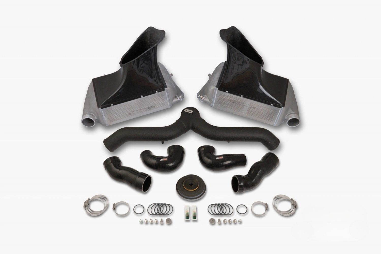 • The do88 intercoolers for the 997.2 Porsche 911 deliver a significant 51.8°F reduction in IAT and a 19% increase in airflow compared to the previous version. Designed with cast end tanks for precise airflow distribution and 70mm connections paired with CFD-tested hoses, the intercoolers optimize cooling efficiency while minimizing pressure drop. The kit includes a lightweight air duct made from real prepreg carbon, featuring proper seals to maximize ambient air usage, and a 3D-scanned upper ambient air guide to ensure a perfect fit with the vehicle’s integrated components. High-temperature hoses, rated to 464°F, enhance durability and airflow performance.