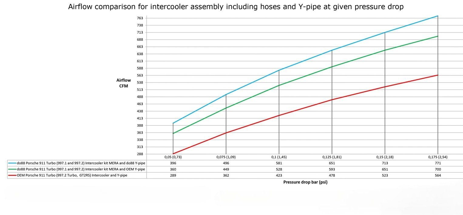 • Five test runs were conducted with the car fitted with OEM intercoolers, followed by a quick swap to do88 intercoolers. After a brief shakedown, another five runs were performed under identical conditions. The results showed a significant 32.4°F decrease in inlet air temperature, as illustrated in the graph. Through extensive development, including the refinement of end tank design and the selection of a high-performance core, the do88 intercoolers demonstrated superior heat transfer and airflow efficiency. Verified using the in-house Superflow SF-1020 Probench as a complete system with hoses on both the inlet and outlet, the do88 intercoolers deliver reliable MERA performance.