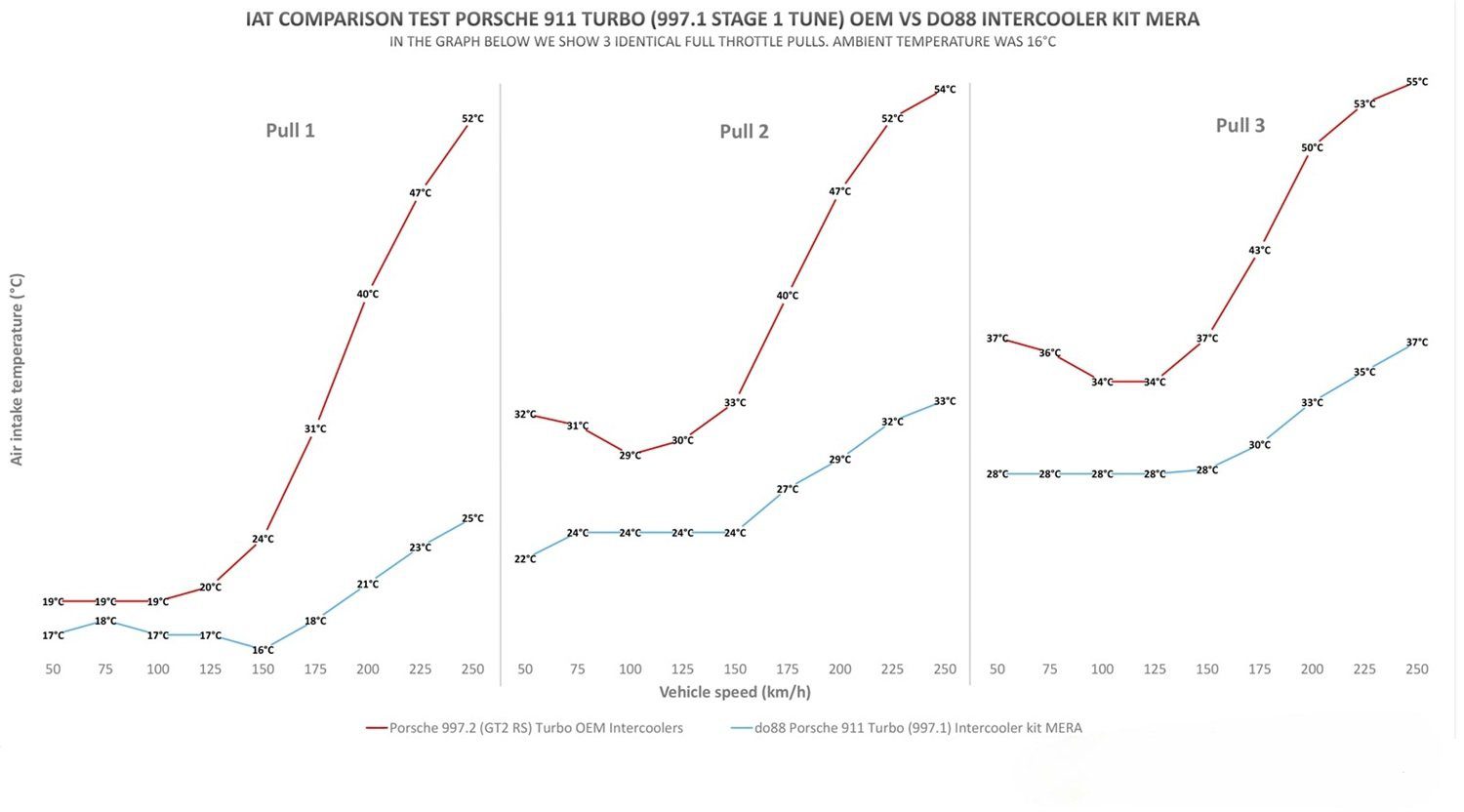 • The do88 intercoolers significantly reduce intake temperatures, offering a marked improvement over the OEM 997.2 units. Data collected using an AIM race logger during five consecutive back-to-back full-throttle runs without cooldown demonstrates their performance. The tests, conducted on a Stage 1 tuned Porsche 997, involved accelerations from 30 to 155 mph with the car set to Sport Plus mode and AC turned off to maintain consistent testing conditions.