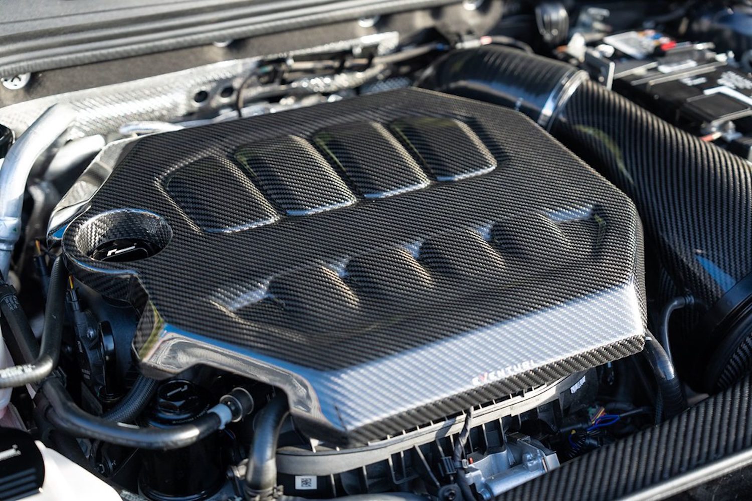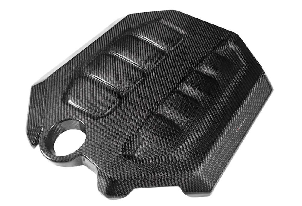 Eventuri’s gloss carbon engine cover for the VW Golf MK8 is a pre-preg carbon, direct-replacement piece that mounts to OEM points for an exact fit.