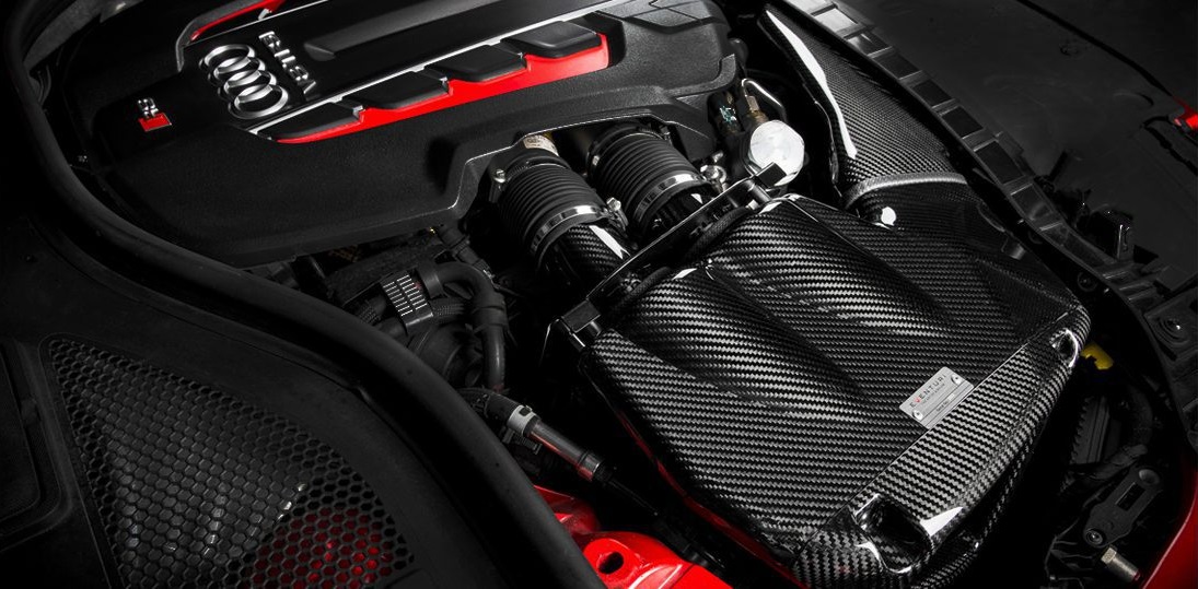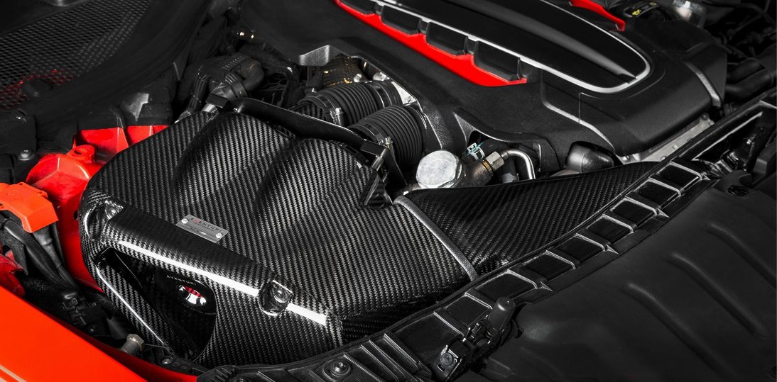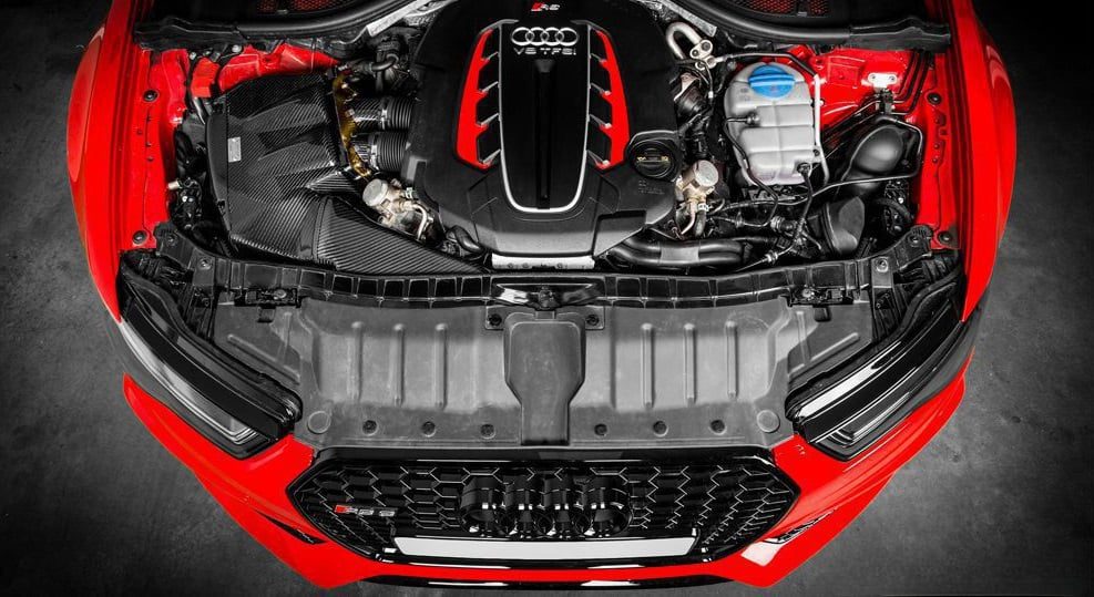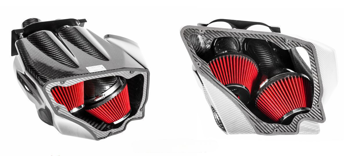 The Audi C7 RS6/RS7 Eventuri intake sets a new standard for intake design on this platform. It was developed with two main objectives: 1) To de-restrict the turbo inlet paths, and 2) To maintain low inlet temperatures. The first goal was achieved by providing each turbo with its own filter and Venturi stack, reducing drag and enabling the turbos to operate more efficiently. The second goal was met by enclosing the filters inside a carbon airbox and adding an additional scoop behind the front grille to feed the intake with ambient air. Given the multiple heat sources in the C7 RS6/RS7 engine bay, a simple setup of open filters and shields would lead to higher intake air temperatures (IATs). Eventuri’s carbon airbox enclosure is designed to optimize the available space and block all heat sources, resulting in industry-leading performance gains and aesthetics.
