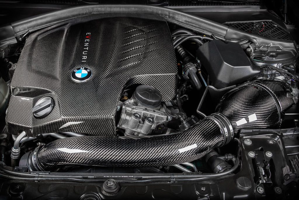 Eventuri’s updated N55 intake system exemplifies their “Complete System” approach, achieving a balance between unrestricted airflow to the Venturi housing and effective cold air saturation through the new sealed duct and scoop combination. The sealed duct and heat shield work together to keep engine bay heat away from the filter, maintaining low intake air temperatures (IATs). Every aspect of the design, from the prepreg carbon components to the precision bracket work, has been meticulously developed. This intake system sets a new standard for design and craftsmanship on the F Chassis platforms.