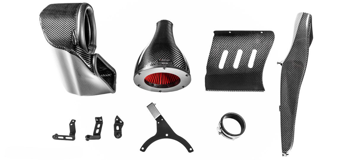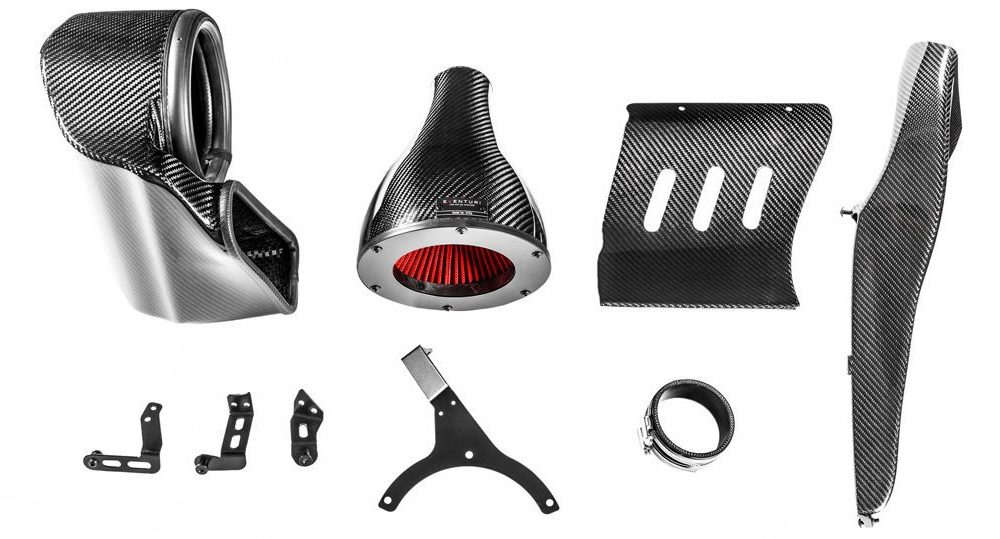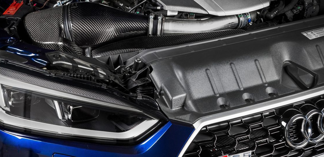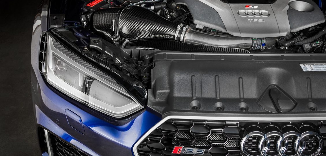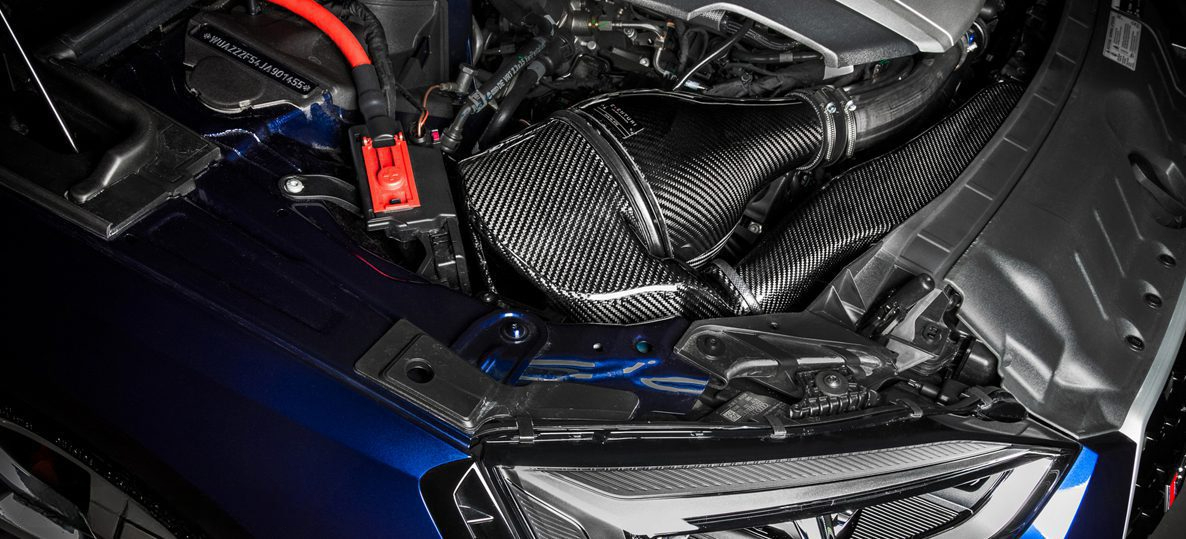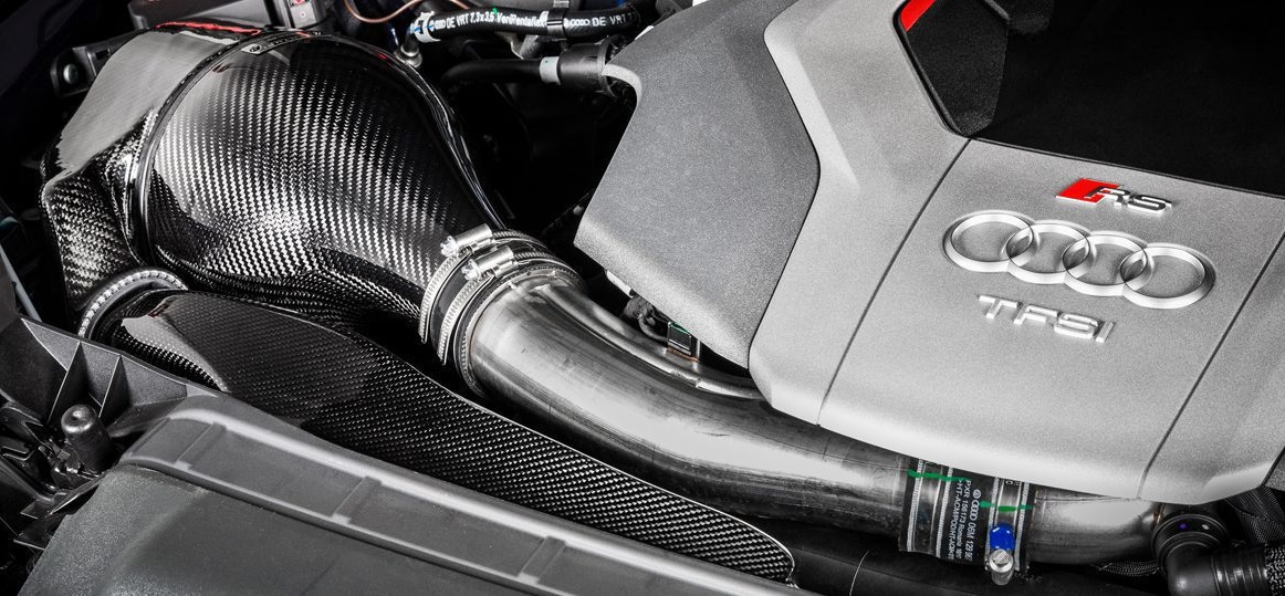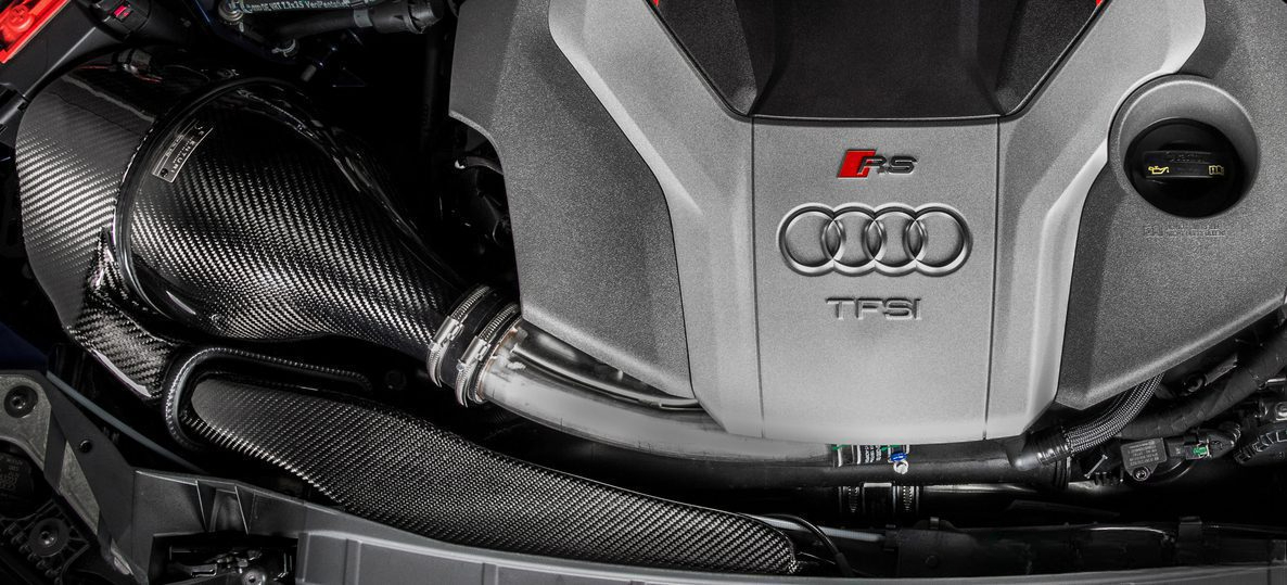 • The B9 RS4 and RS5 Eventuri system features patent-pending carbon fiber housings with bespoke Gen-2 filters, providing an aerodynamically efficient airflow path from the filter to the inlet tubes. Unlike standard cone filters with heat shields, this design invokes the Venturi effect to optimize airflow and performance.