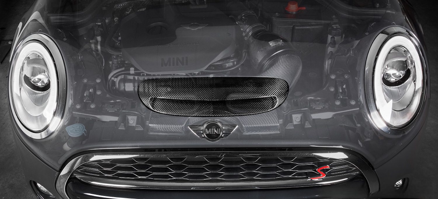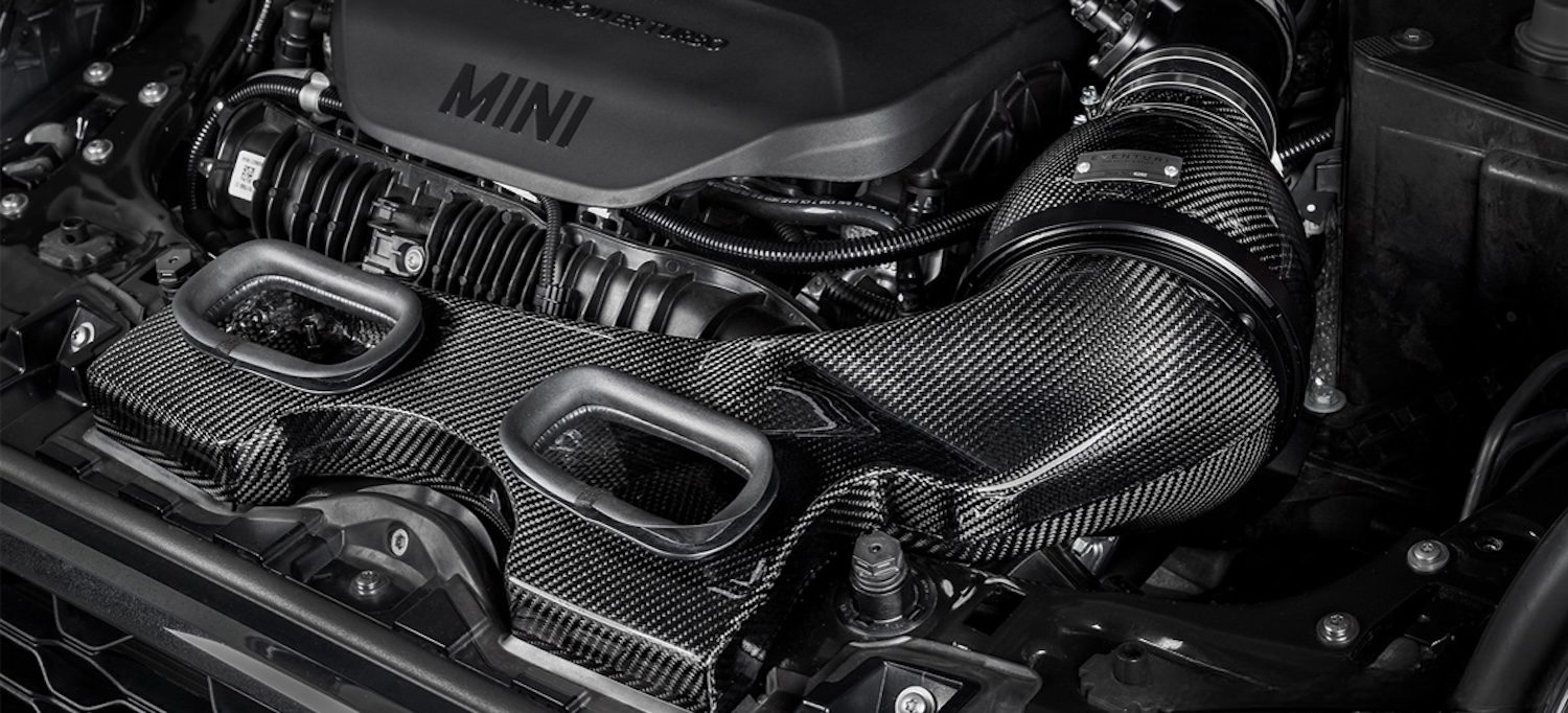 Eventuri’s F56 MINI intake system exemplifies its Complete System principle. The fully sealed architecture prevents the turbo from ingesting engine-bay heat, while a functional bonnet scoop actively feeds ambient air into a higher-volume intake duct that also draws from the OEM location above the radiator. This sealed, scoop-fed design lowers intake temperatures versus the stock air box and mitigates heat soak especially on higher-powered MINIs. For the smoothest airflow to the turbo, Eventuri employs its Patented filter housing paired with a CNC-machined MAF tube.