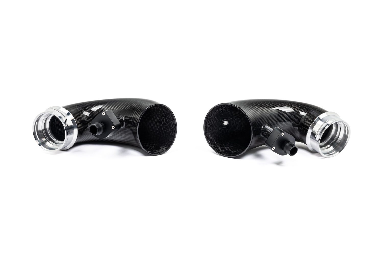 Eventuri presents the F9X X5 M / X6 M Pre-LCI Carbon Turbo Inlet Set engineered to optimize the airflow path from intake to turbo. Compared to the restrictive factory tubes that taper immediately after the intake connection, Eventuri’s inlets preserve a larger internal diameter all the way to the turbo interface and employ carefully managed curvature to minimize resistance. The CNC-machined flange integrates an internal radius to transition cleanly to the stock turbo size, maintaining volume while smoothing the final reduction. Constructed from pre-preg carbon fiber with precision-machined hardware, the inlets also elevate the engine bay aesthetic. The result is a less resistive flow path that helps the turbos reach peak boost earlier in the rev range benefits that become even more apparent on tuned vehicles where higher boost increases flow demand.