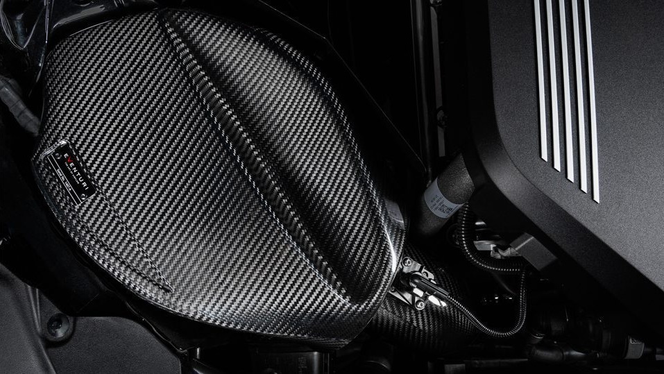 • A fully sealed airbox can present the challenge of restricted cold air intake. The stock airbox pulls air from a single duct extending to the front bumper. During development, Eventuri identified an additional source of cold air—a gap between the wheel arch and the chassis, where the airbox sits. To utilize this extra airflow, they designed a scoop at the back of the airbox that extends into the wheel arch, visible behind the front wheel after installation. This second air feed allows the turbo to pull air from a larger area, effectively reducing restriction.