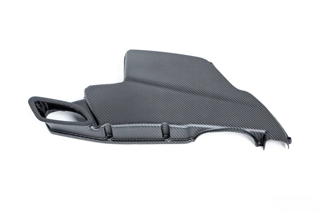 The Eventuri Gloss Carbon Fiber Airbox Lid for the E90 BMW M3 enhances both the performance and aesthetics of your engine bay. Crafted from prepreg carbon fiber, this airbox lid offers improved induction sound while maintaining a sleek matte black finish. Designed with perfect fitment, it secures in the same way as the stock part, making installation simple and seamless. This upgrade not only adds a premium touch but also contributes to a more engaging driving experience.