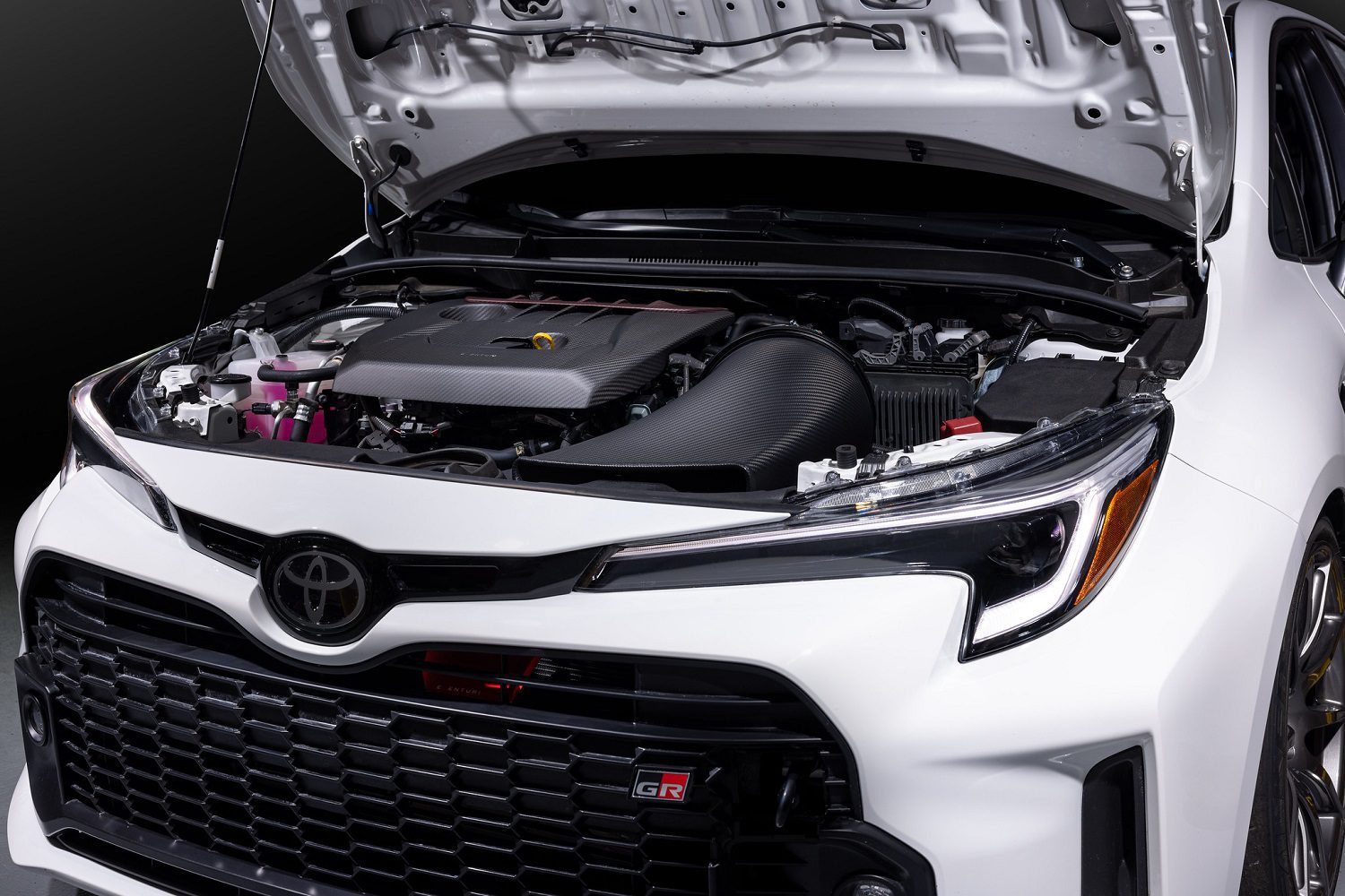 • The GR Corolla Eventuri system features patented carbon fiber housings designed to provide an aerodynamically efficient airflow path from the filter to the turbo. Unlike conventional cone filters with heat shields, this system employs the Venturi effect to maintain laminar airflow and reduce drag on the turbo, enhancing overall performance.