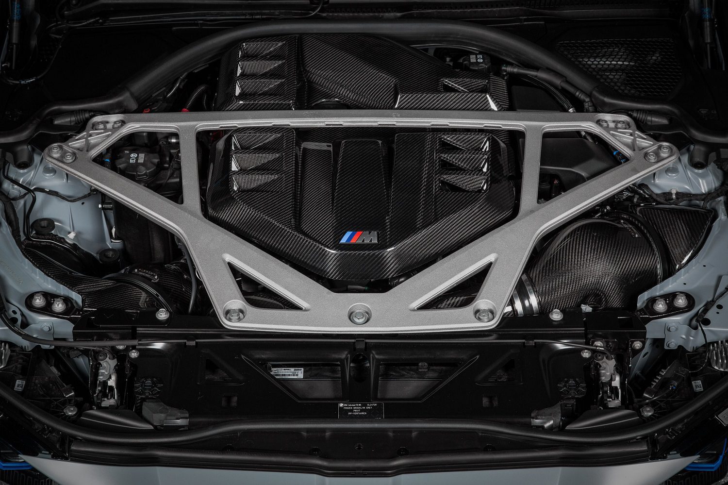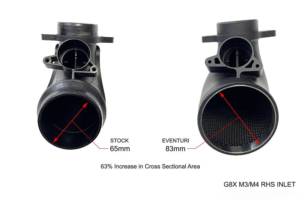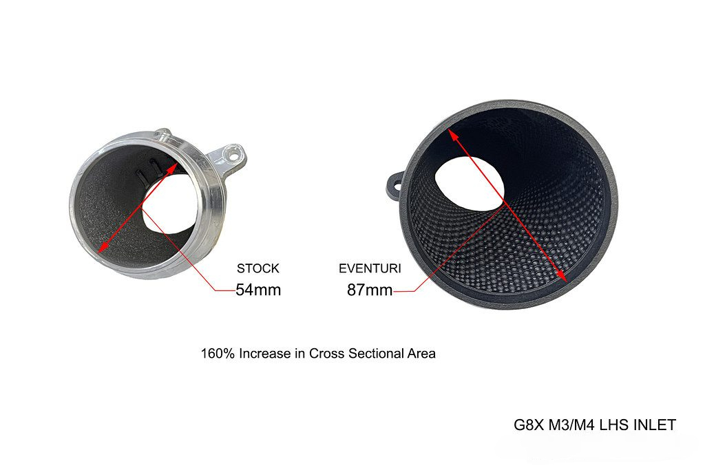 The revised G8X intake, now designed to accommodate the CSL strut brace, has been introduced after extensive research and development. This intake system not only surpasses the performance of the stock M3/M4 but is also compatible with high-powered builds exceeding 1000hp. The redesign involves a complete overhaul, from the airboxes to the turbo inlets, with the primary goals of minimizing pressure loss, maximizing flow rate, and maintaining low inlet temperatures. The available space has been optimized to house two custom-made filters, offering a 40% larger filtration area compared to the stock system. These filters are housed within patented Venturi housings, which efficiently channel air toward the turbo inlets. The inlets themselves feature a cross-sectional area up to 160% larger than stock, with an advanced dimpled inner surface design that reduces frictional losses and creates an air cushion along the wall surface, allowing for higher flow rates and reduced pressure loss. This design enables the turbos to draw air with less resistance, lowering the wastegate duty cycle and improving overall performance.