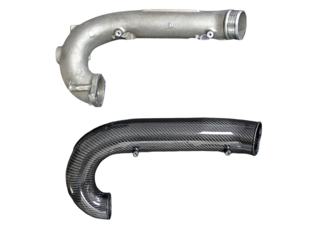 • Crafted from pre-preg carbon fiber, the Turbo Tube is a one-piece design that maintains a smooth flow path to the turbo. It has an inlet diameter starting at 78mm internally, increasing to 88mm across the main body of the tube before tapering down to the turbo inlet flange. In comparison, the stock turbo tube has an internal diameter of only 63mm, resulting in a cross-sectional area increase of over 96% at its largest point. Additionally, being made from carbon fiber, it is much lighter and has lower thermal conductivity than the stock cast aluminum tube.
