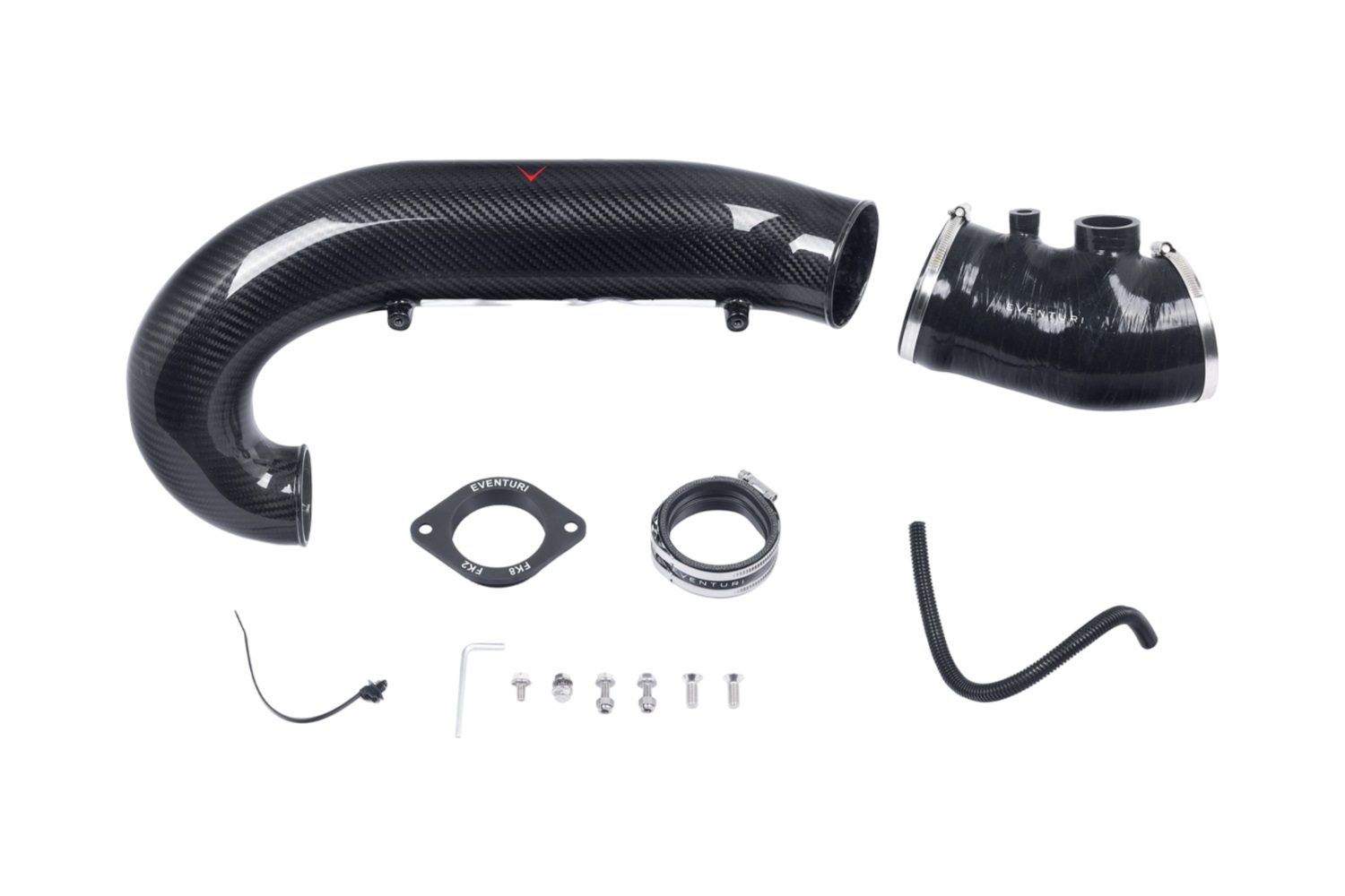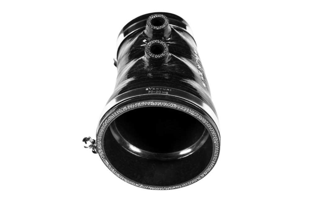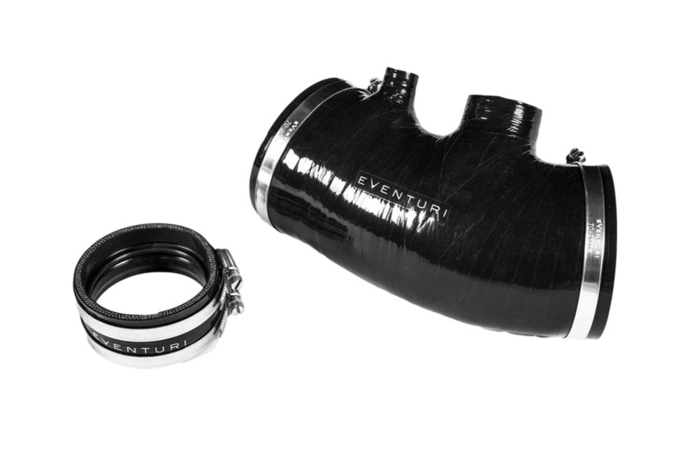 • Eventuri’s silicon joiner hoses ensure a perfect fit and maintain smooth internal airflow. The main silicon hose at the inlet side features an internal step that mates against the turbo tube, eliminating the potential for turbulence against the exposed wall thickness of the tube. The turbo coupler has a silicon spacer ring that separates the carbon from the metal turbo flange, acting as a thermal barrier to reduce heat conduction from the hot turbo flange to the carbon tube.