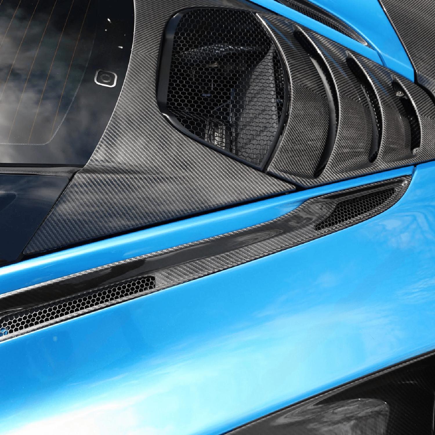The Exotic Car Gear Carbon Engine Lid Vents & Air Bridges for the McLaren 720S and 765LT [ECG-MCL-720ELV] offer a striking upgrade that enhances both the performance and appearance of your vehicle. These components are made from high-quality carbon fiber, ensuring a lightweight yet durable construction that withstands the rigors of high-performance driving. The engine lid vents improve airflow and cooling efficiency by allowing hot air to escape from the engine bay, optimizing engine performance and reducing temperatures during intense driving sessions. The air bridges further enhance the aerodynamic qualities of the car, helping to streamline airflow over the vehicle for improved downforce and stability at higher speeds. Designed to match the McLaren 720S and 765LT’s aggressive styling, these carbon fiber pieces add a sleek, race-inspired look to the rear of the car.