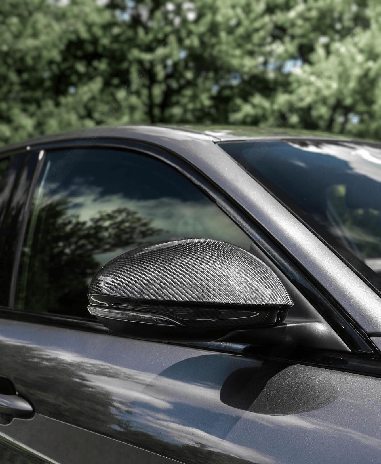Exotic Car Gear Carbon Mirror Caps for the Alfa Romeo Giulia combine lightweight durability with a sleek, modern design. Crafted from premium 2×2 dry carbon fiber, they enhance the vehicle’s exterior while seamlessly fitting the bold styling of the Giulia. These mirror caps exemplify superior craftsmanship, offering a stylish and performance-focused upgrade.