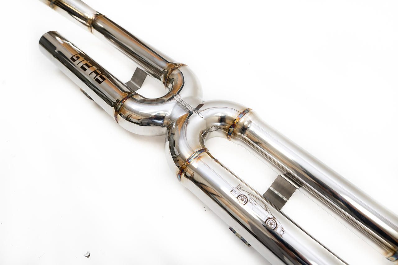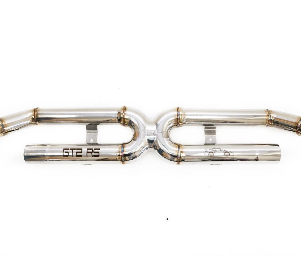 The Fabspeed Porsche 991.2 GT2 RS Supersport X-Pipe System offers a superior alternative to the OEM GT2RS titanium rear muffler, providing heightened exotic sound, increased power, and improved throttle response. With larger diameter CNC mandrel bent tubing, this system delivers enhanced performance for your vehicle. It presents a straightforward 30-minute upgrade, safeguarding your titanium muffler. Engineered with Fabspeed’s renowned lost wax investment cast x-pipe, this system optimizes exhaust flow on each side, facilitated by a CAD center opening in the x, resulting in an amplified sports car sound and elevated performance levels.