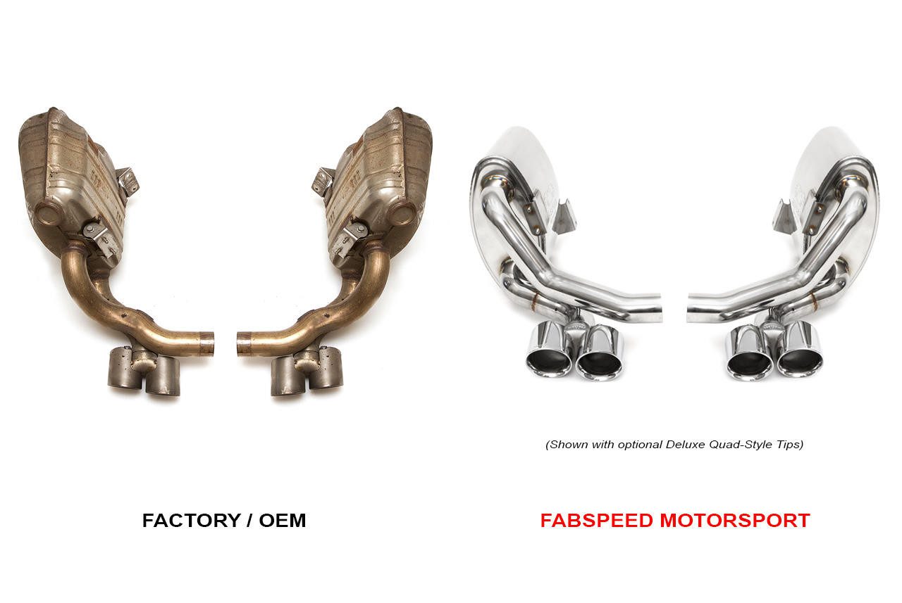 The 991 Carrera Maxflo Performance Side Exhaust system serves as a replacement for the factory side mufflers, effectively enhancing both exhaust flow and overall power, all while delivering a deep and resonant sports car sound. This system provides flexibility, allowing it to be used with the OEM outlet tips or upgraded to include Deluxe Quad-Style Tips. Fabspeed’s recommendation is to pair these Side Mufflers with a Center Muffler Bypass X-Pipe for non-PSE equipped vehicles, resulting in a slightly more throaty and deeper exhaust note.