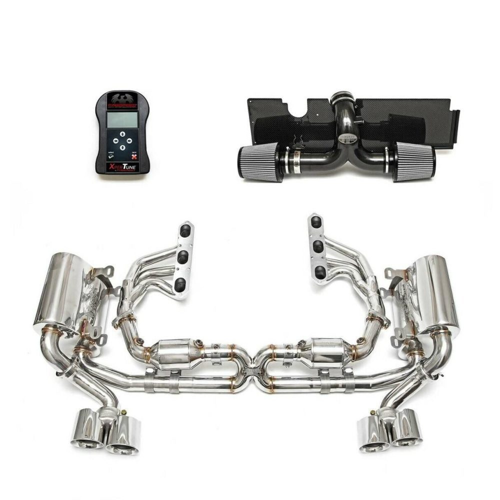 Fabspeed offers the 997 Carrera performance package, a comprehensive upgrade that replaces the factory components with high-performance mufflers and either 200-cell HJS sportcats or competition pipes. This transformation results in a more resonant and robust exhaust note while enhancing power and throttle response. The package also includes performance headers, substituting the restrictive factory headers with high-flow motorsport headers. Additionally, the factory airbox is replaced with Fabspeed’s carbon fiber competition intake system, facilitating increased cold air intake for improved power and sound. These enhancements are further fine-tuned with the Fabspeed ECU tune, which optimizes various parameters such as timing and air-fuel ratios to maximize the benefits of the upgraded components.